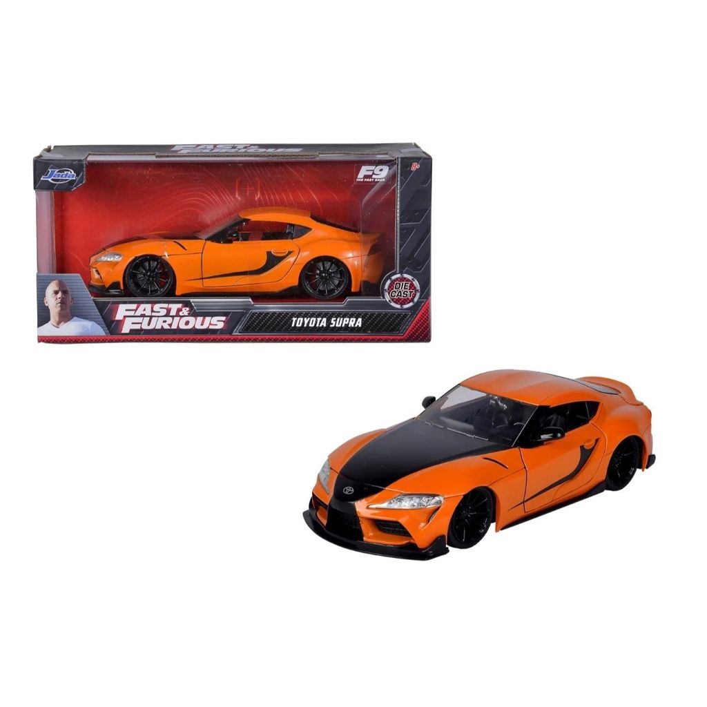 Toyota GR Supra från Fast & Furious-filmen F9 (The Fast Saga) i skala 1:24. Toyotan är orange med bland annat svart motorhuv.