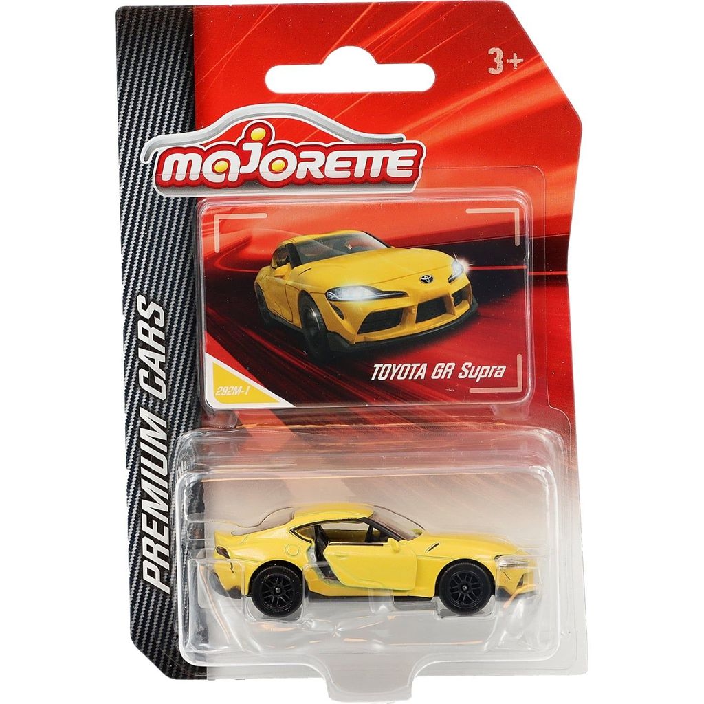 Gul Toyota GR Supra i skala 1:56 från Majorettes serie Premium Cars.