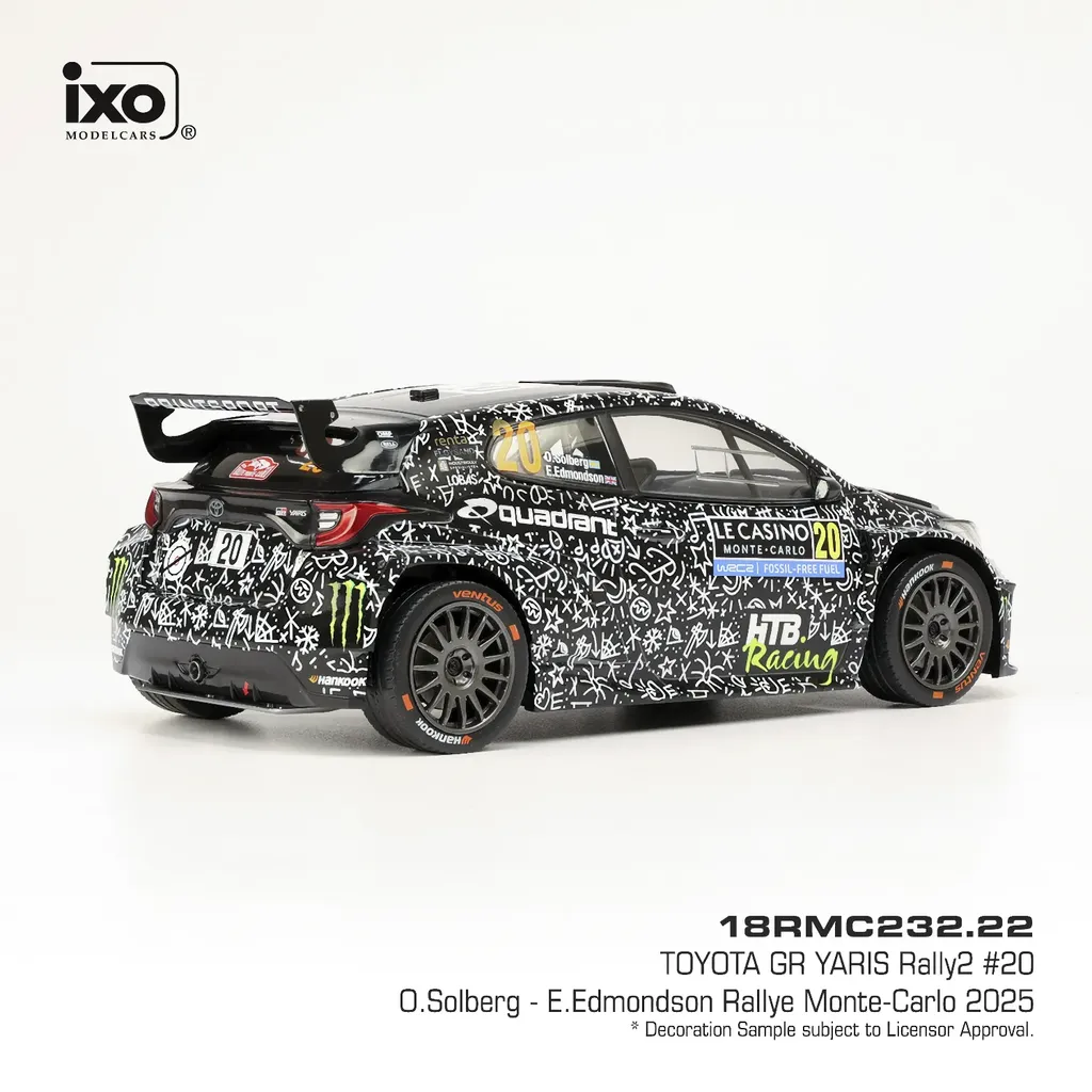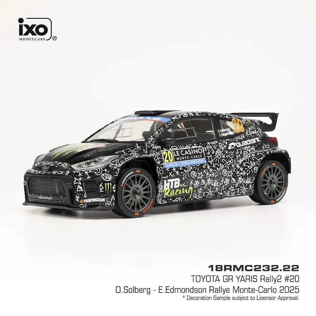 Oliver Solberg och Elliott Edmondson körde denna Toyota GR Yaris Rally2 (Toyota Gazoo Racing) under Rallye Monte-Carlo 2025. Modellen är tillverkad av Ixo Models i skala 1:18 (längd 22 cm).