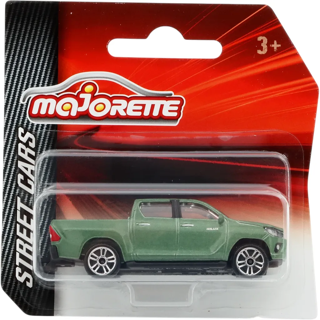 Toyota Hilux Revo med grön lack från Majorette och serien Street Cars. Bilen är tillverkad i metall med plastdetaljer och rekommenderas från 3 år.