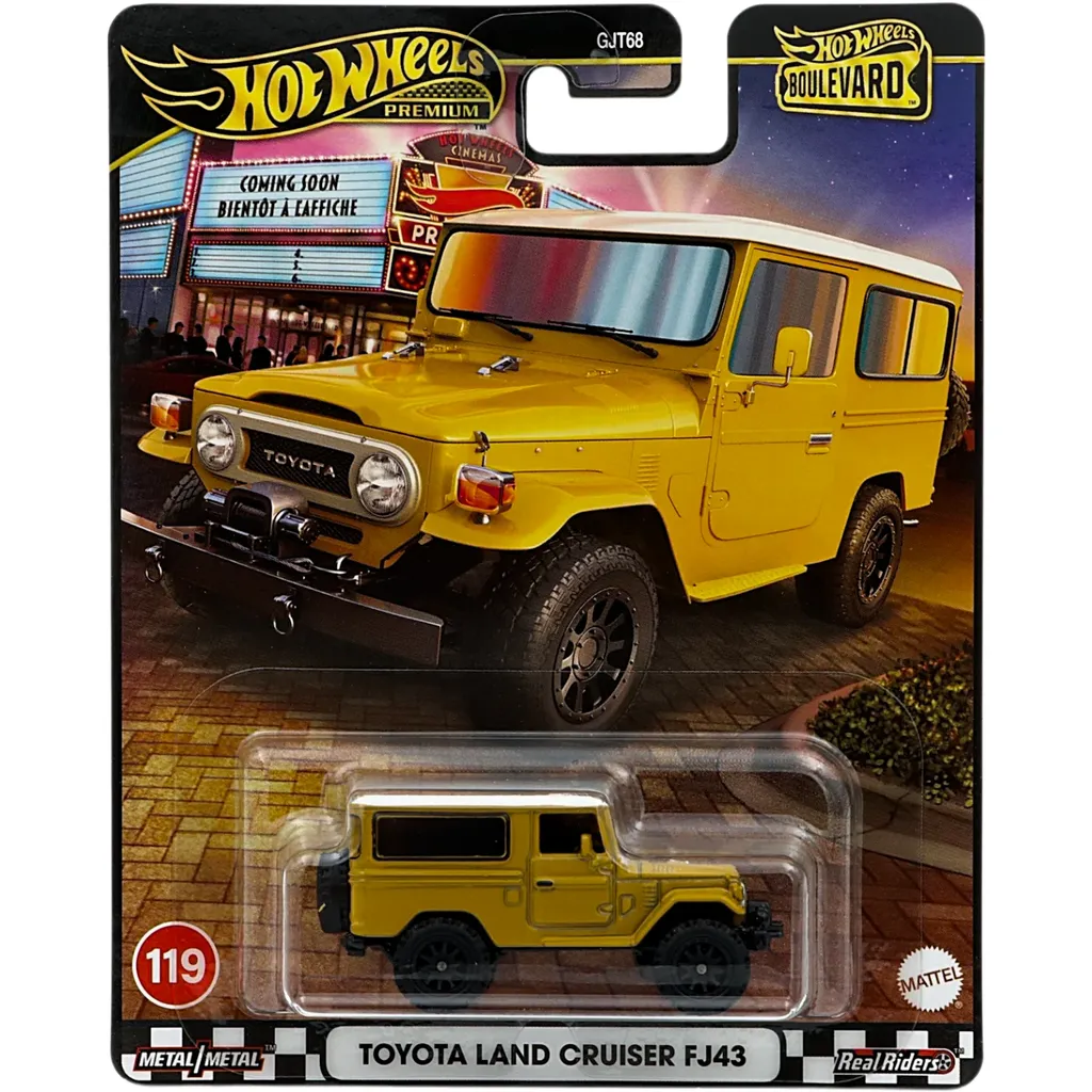 Gul Toyota Land Cruiser FJ43 från Hot Wheels och serien Boulevard där denna Land Cruiser ingår i Mix 1 2025 och är bil 119 i Boulevard-serien.