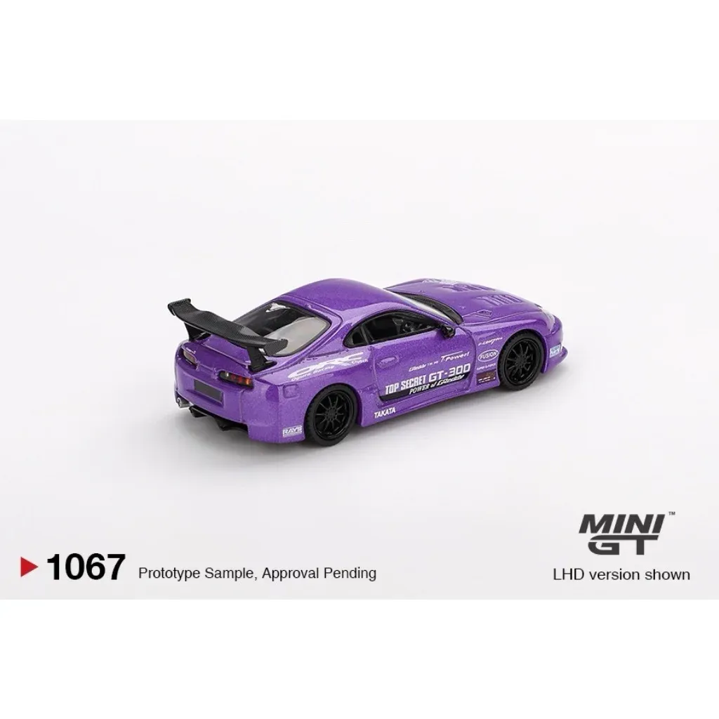Toyota Supra (A80) Top Secret GT-300 som modell från Mini GT i skala 1:64 (ca 7 cm). Lila lack (Top Secret Purple) med vita detaljer och svarta fälgar.