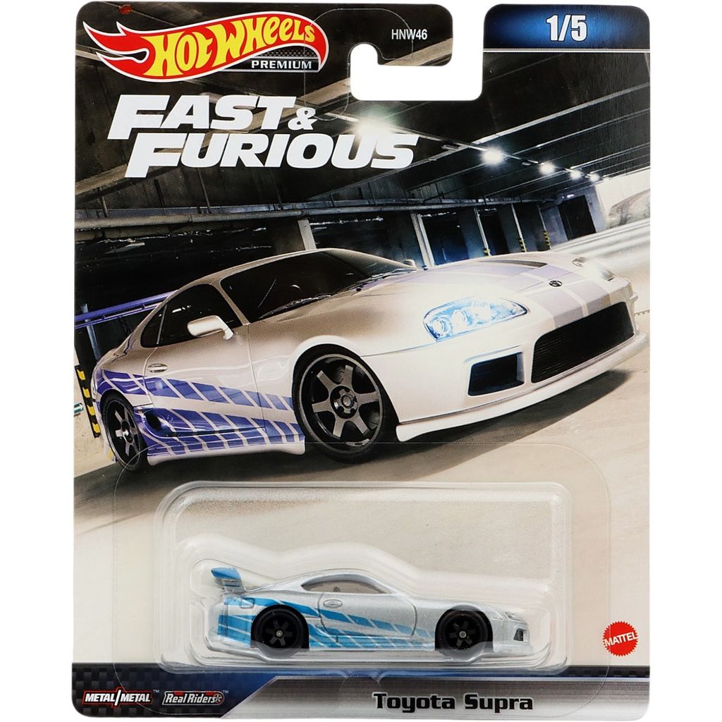 Toyota Supra i silver och blått från Hot Wheels Premium. Bilen ingår i setet Fast & Furious Premium Series och är där bil 1 av 5 i Mix 4 2023.