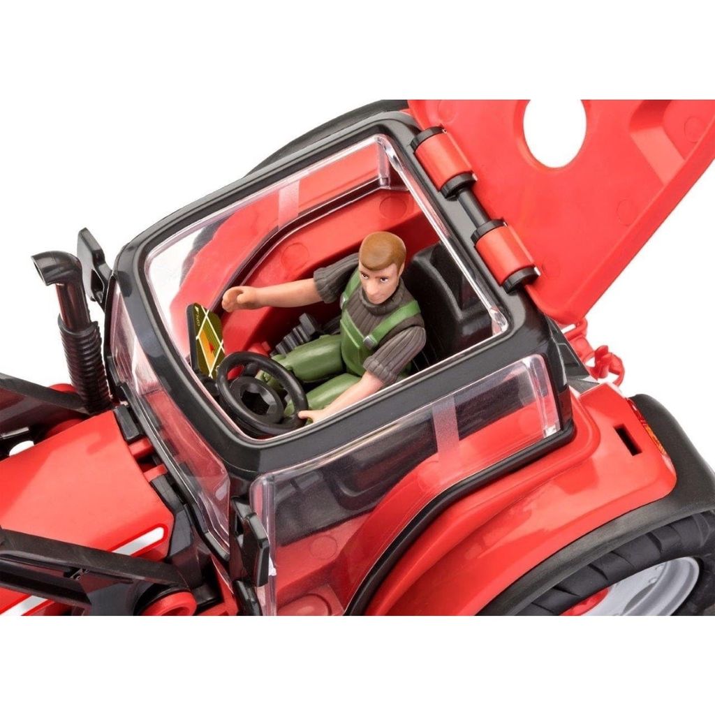 Röd traktor med frontlastare och pallgaffel samt skopa som byggsats från Revell för små byggare. Två höbalar medföljer.