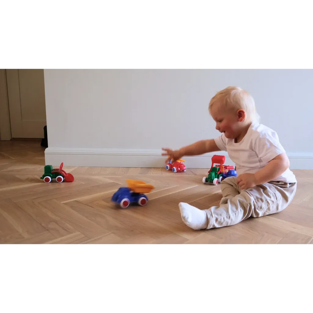 Grön traktor med röd skopa från Viking Toys och serien Maxi Trucks. 14 cm leksaksbil för inom- och utomhuslek.