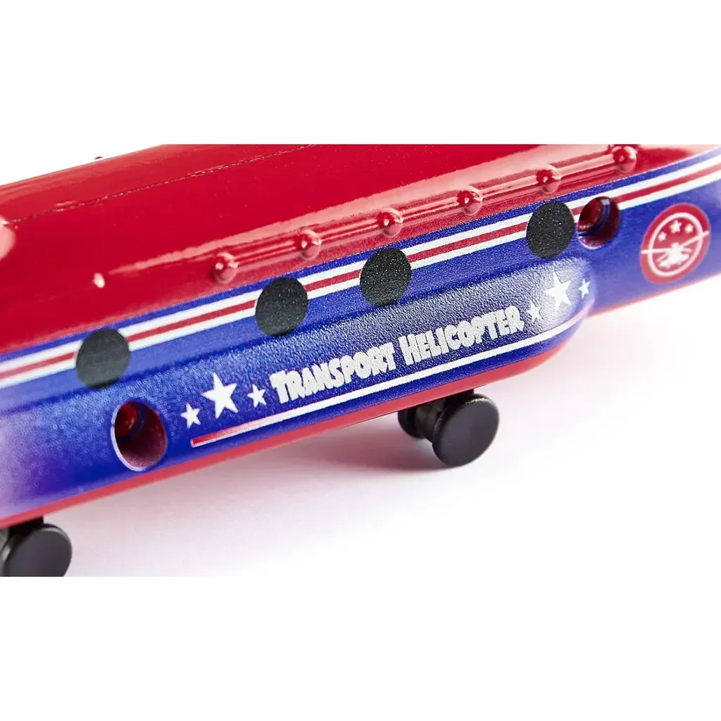 Transporthelikopter från Siku med två stora rotorblad på taket. Helikoptern är röd, tillverkad i metall med plastdetaljer och 12 cm lång.