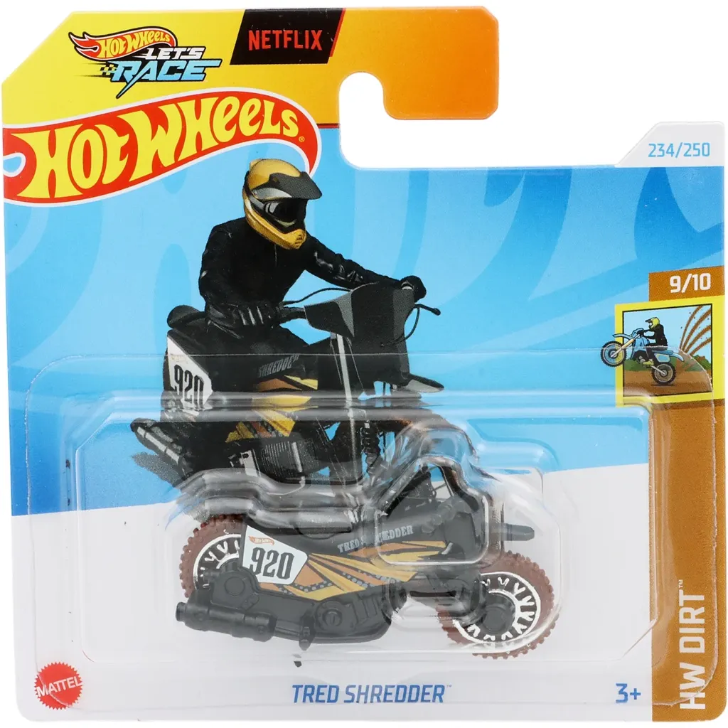 Tred Shredder från Hot Wheels som motorcykel i skala 1:64 (ca 6-7 cm). Cykeln är tillverkad i metall med plastdetaljer och rekommenderas från 3 år.