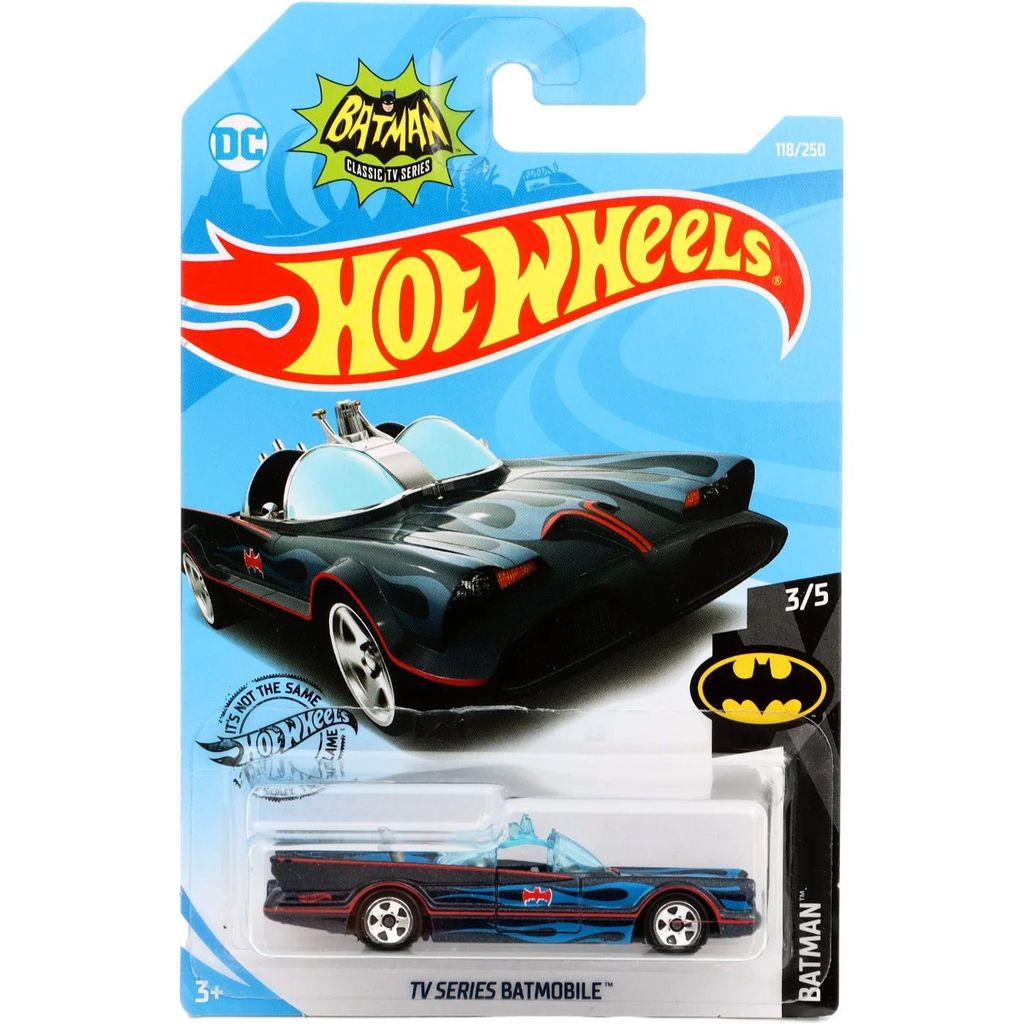 TV Series Batmobile från Hot Wheels och serien Batman där denna leksaksbil är bil nummer 3/5. Bilen ingår i L-case "international long cards" (C4982) 2019.