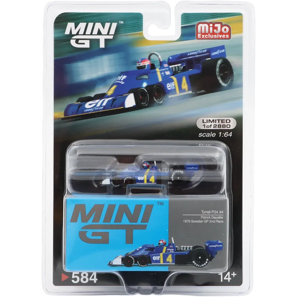 F1-bilen Tyrrell P34 med nummer 4 som kördes av Patrick Depailler då han kom på andra plats under Swedish GP på Scandinavian Raceway i Anderstorp 1976. Bilen är i skala 1:64 (6,4 cm) och tillverkad av Mini GT.