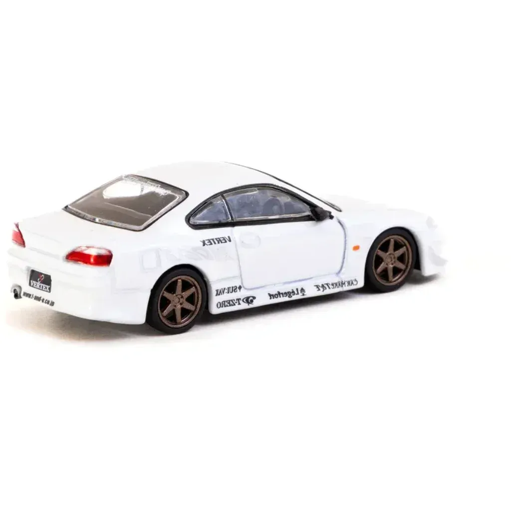 Vit VERTEX Nissan Silvia (S15) från modellbilstillverkaren Tarmac Works och serien GLOBAL64 i skala 1:64 (ca 7 cm).