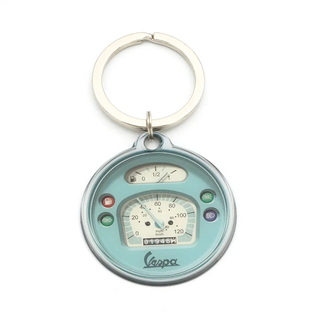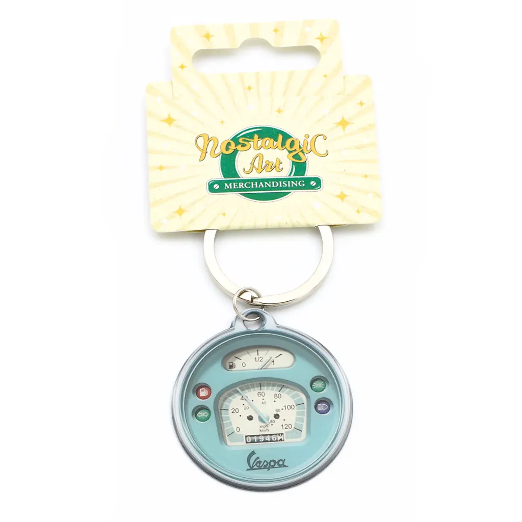 Nyckelring i metall med motiv av en instrumentpanel från en Vespa. Vi ser på panelen bland annat en tankmätare och en hastighetsmätare.