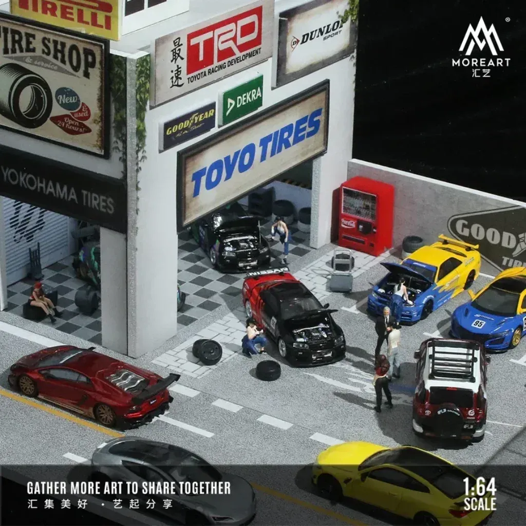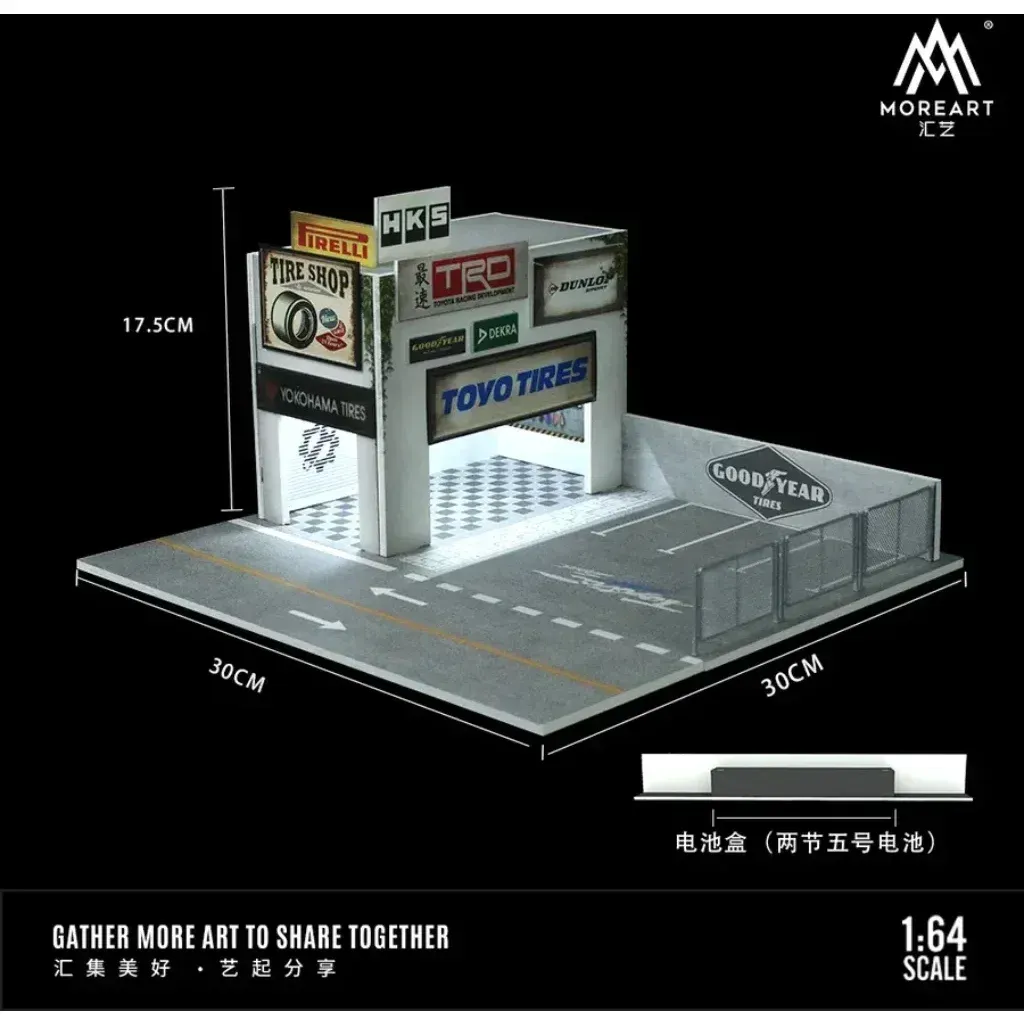Vintage Auto Repair Shop med LED-belysning från Black Box Diorama / MoreArt i skala 1:64.