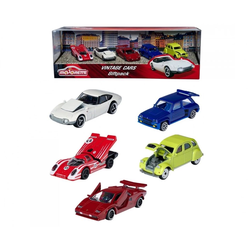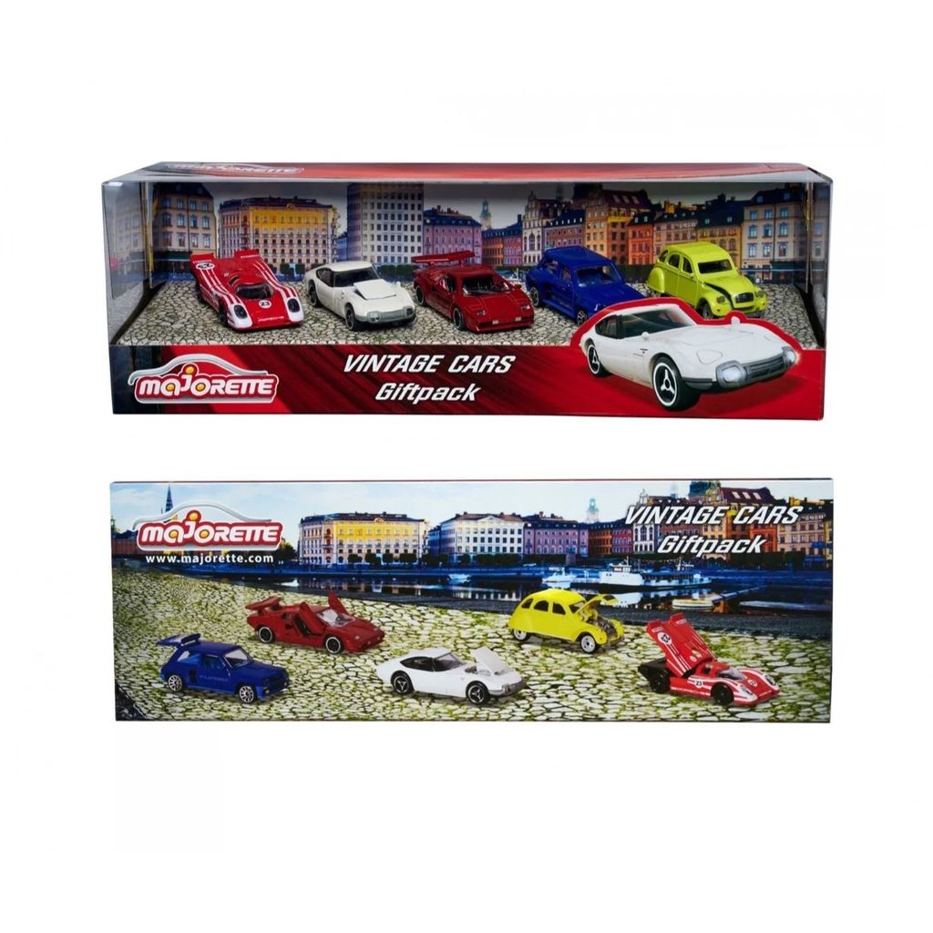 Majorette Vintage Cars Giftpack är ett 5-pack (presentförpackning) med historiska bilar där bilarna nedan ingår. Bilarna är i metall med plastdetaljer och skalor som varierar lite kring 1:64 (bilarna är ca 7,5 cm långa).