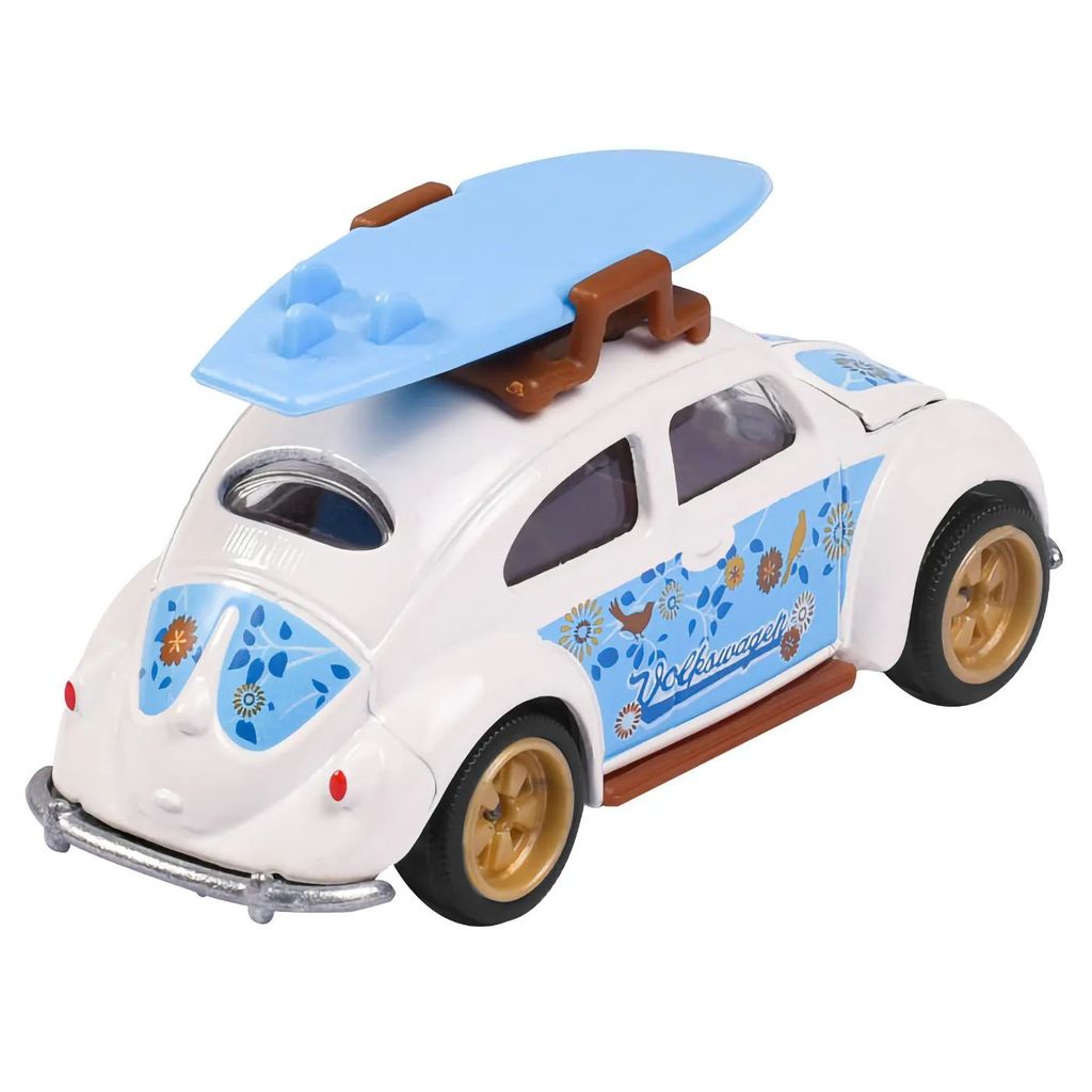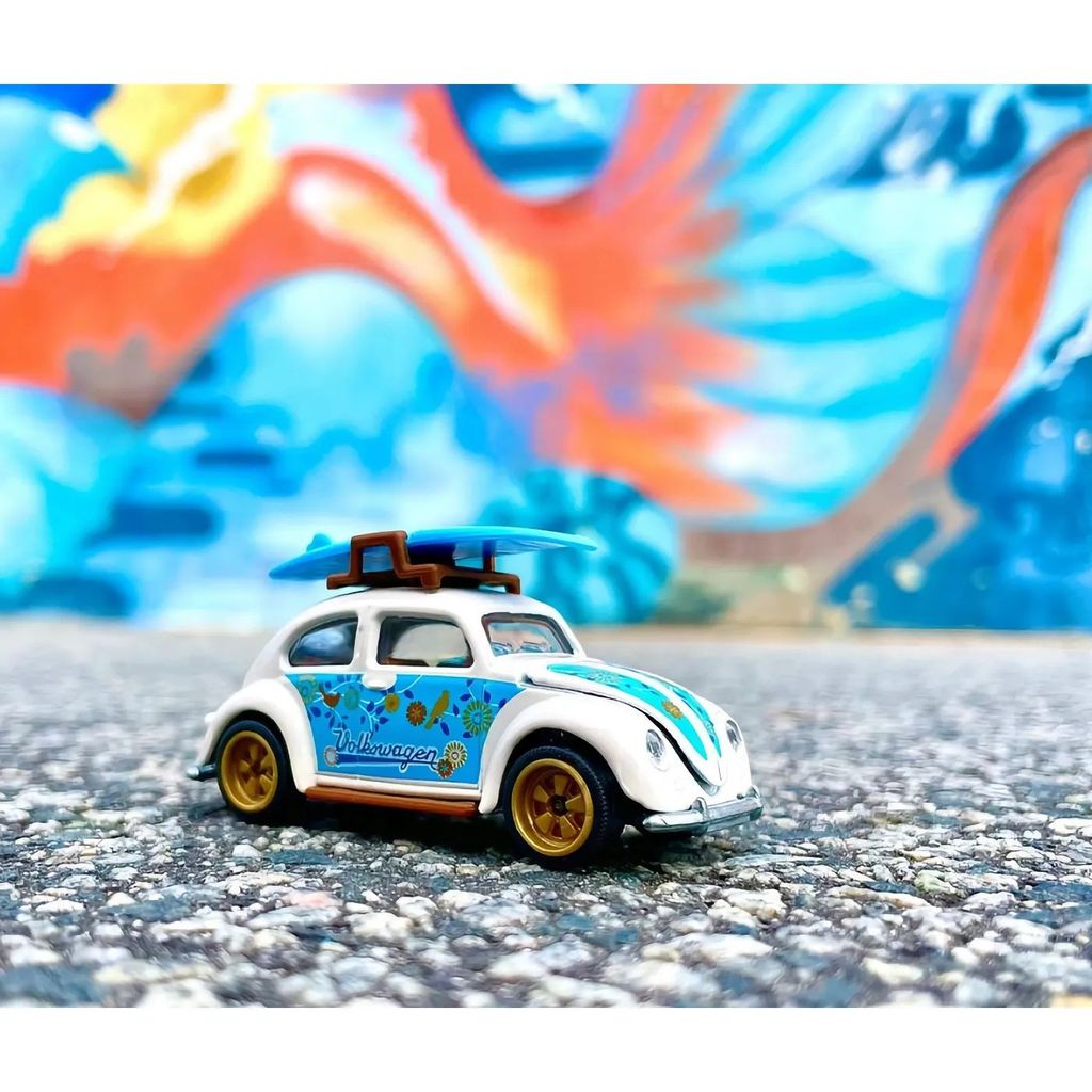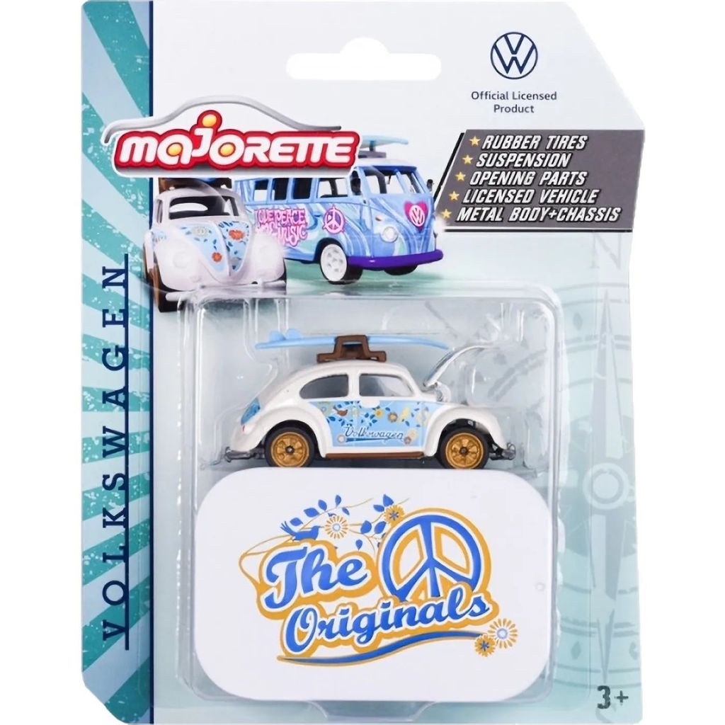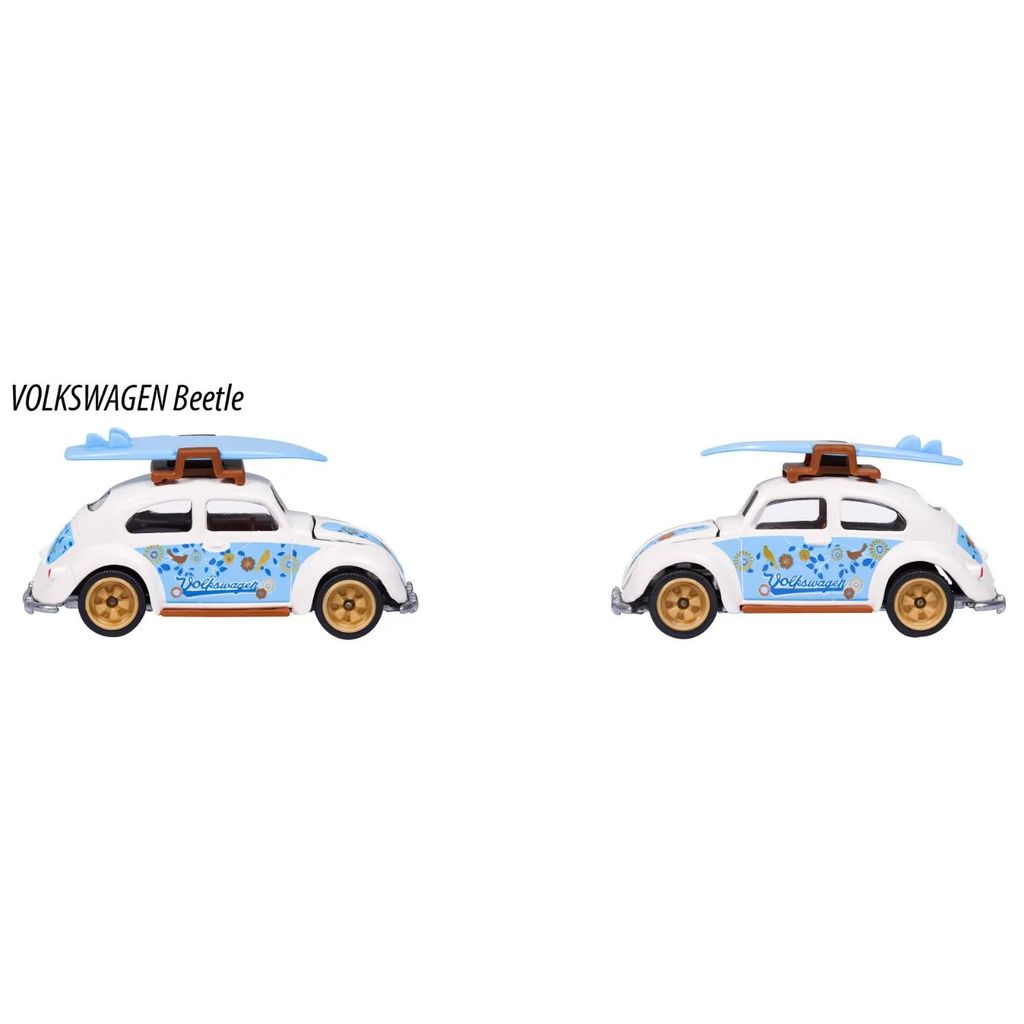 Från Majorettes serie "Volkswagen The Originals - Deluxe" från 2022 kommer denna vita (med blå detaljer) Volkswagen Beetle med en blå surfingbräda på taket.