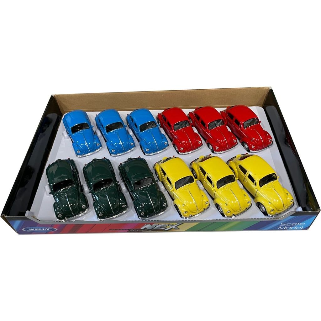 Denna fina Volkswagen Beetle går under flera namn och kallas ibland för folkabubbla eller enbart bubbla. Bilen är i metall med ett chassi (bilens underdel) i plast. Fordonet har pullback, tillbakadrivningsmotor, som möjliggör att bilen åker framåt genom att man först drar den bakåt. Öppningsbara dörrar. Skalan anges av Welly att vara i spannet 1:34-1:39.
