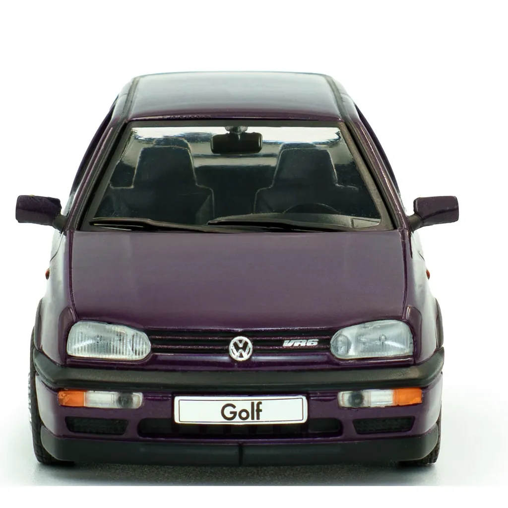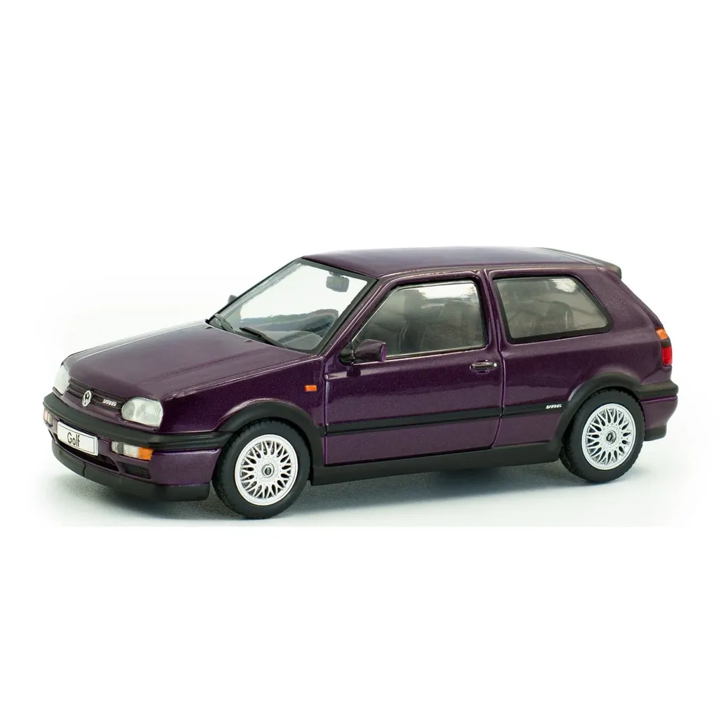 Volkswagen Golf Mk3 VR6, årsmodell 1994, som modellbil från Solido i skala 1:43 (9,5 cm). VR6:an är lila (Dusty Mauve Pearl) med silverfärgade fälgar.