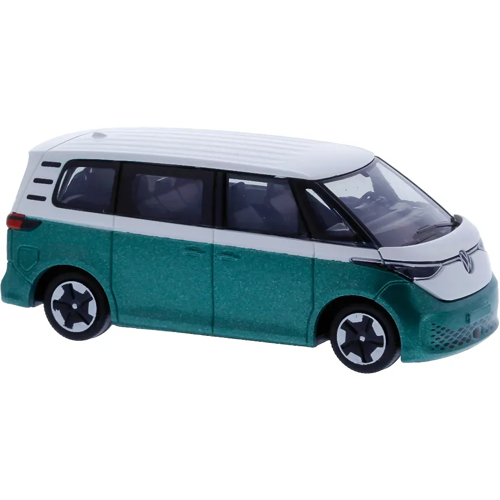 Modell av en vit och grön Volkswagen ID. Buzz i skala 1:87 (5,4 cm).