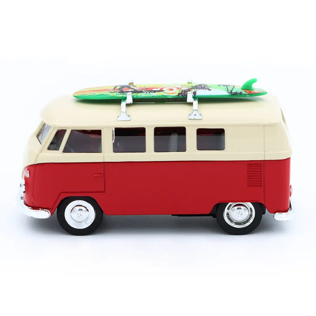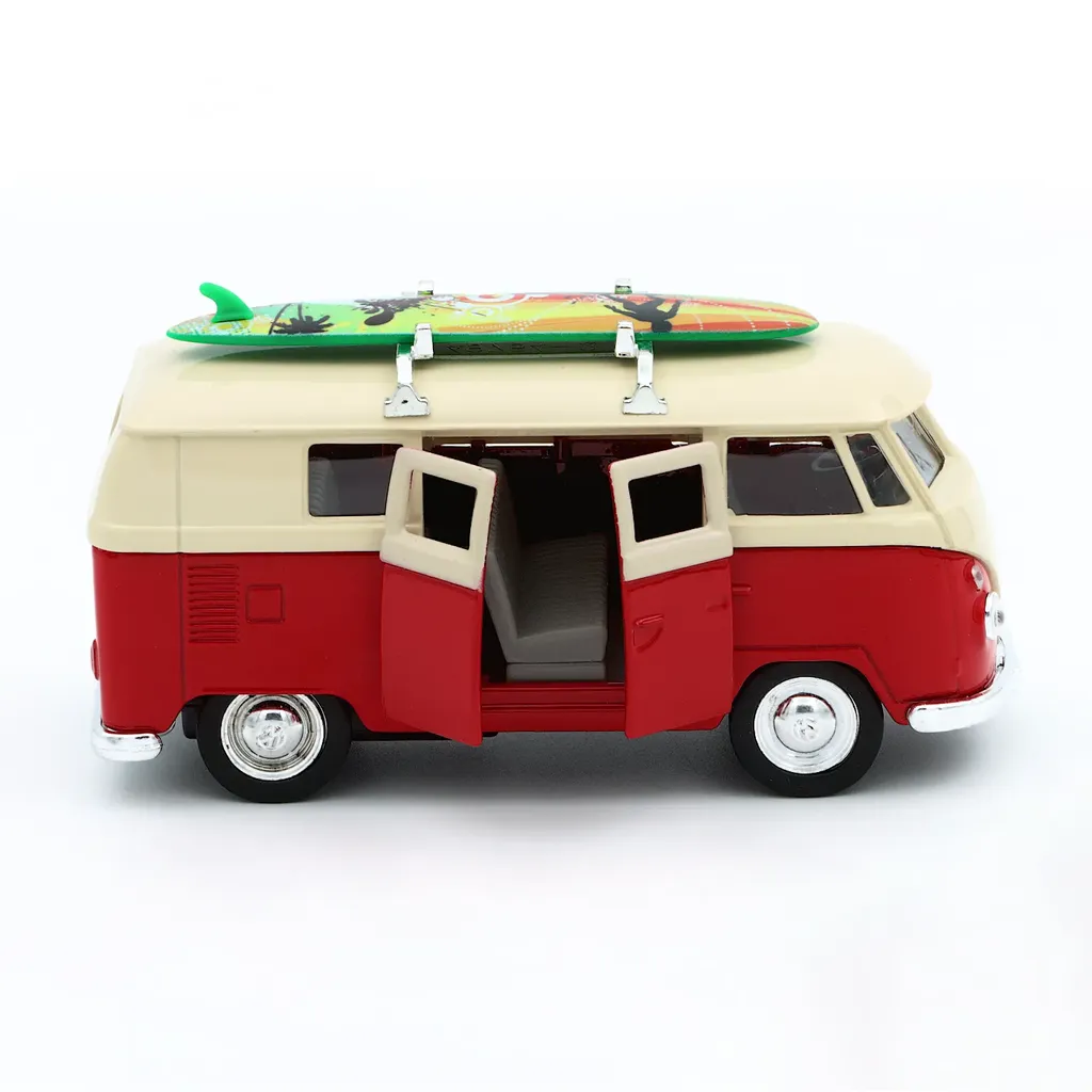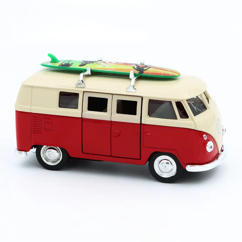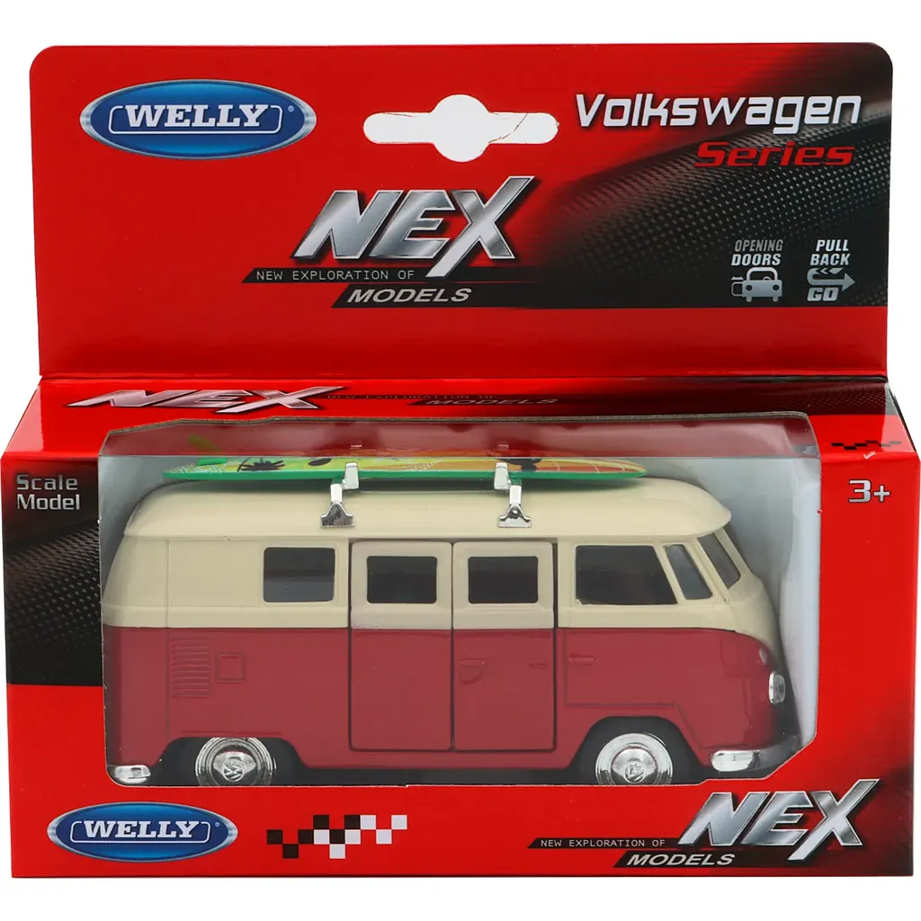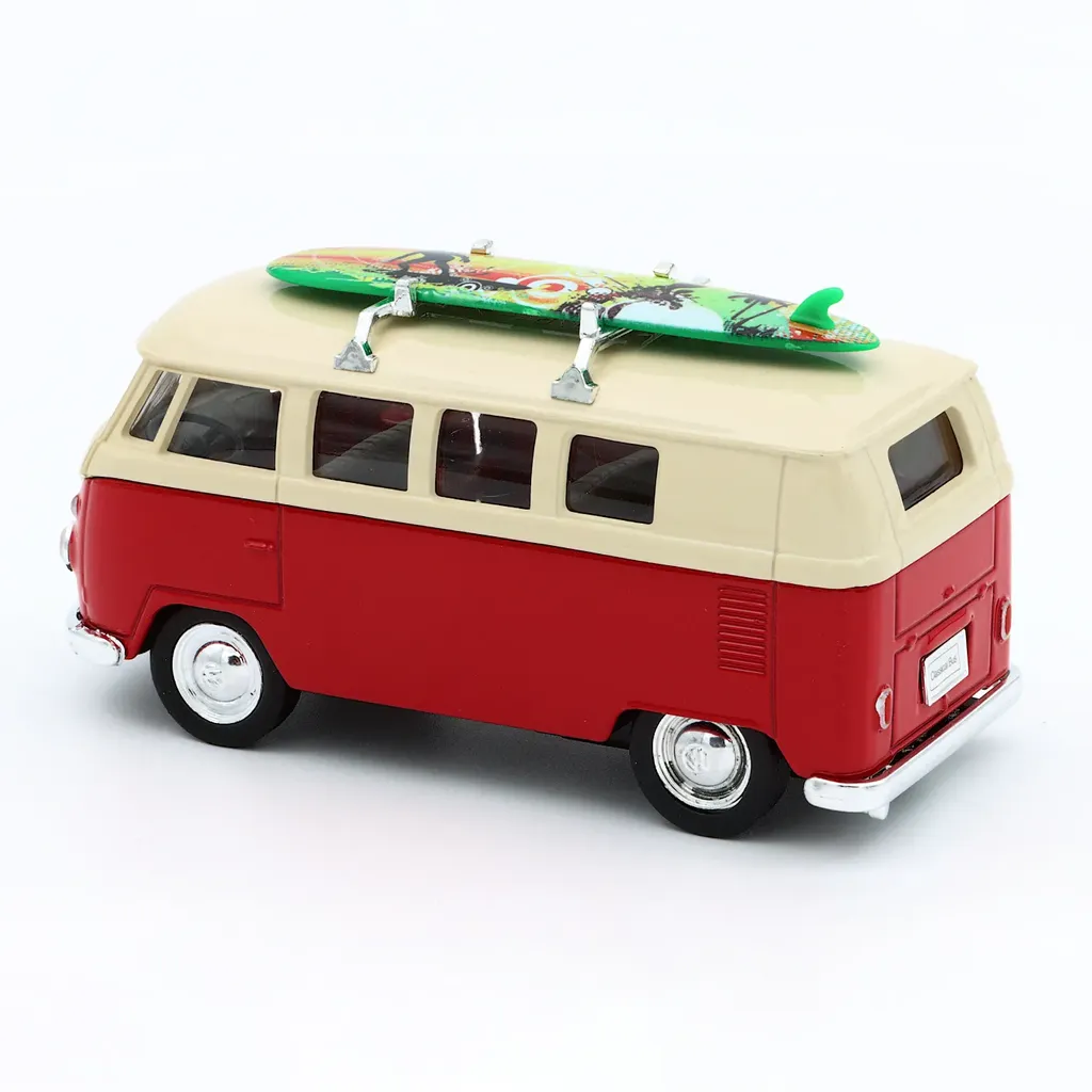 Folkabussen T1 från 1963 som leksaksbil från Welly. Bussen är 11 cm lång (skala 1:34). Bussen är röd med vit/beige ovandel och har en surfbräda på taket.