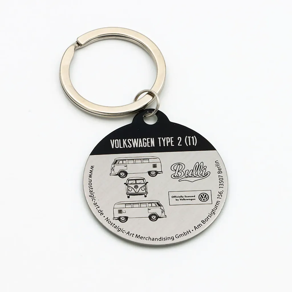 Nyckelring i metall med motiv av en ljusblå och vit Volkswagen T1 (Type 2).