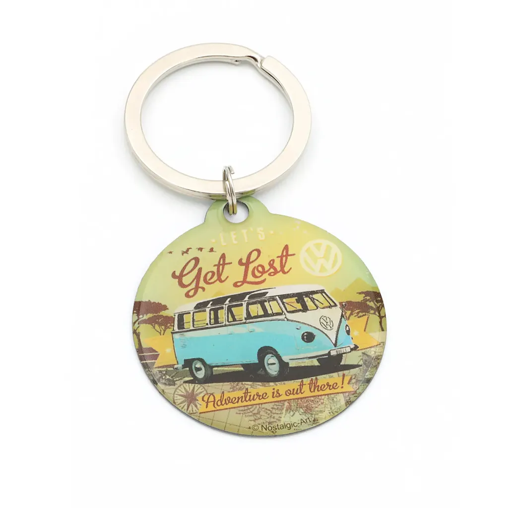 Nyckelring i metall med motiv av en ljusblå och vit Volkswagen T1 (Type 2) och texterna "Let's Get Lost" och "Adventure is out there!".