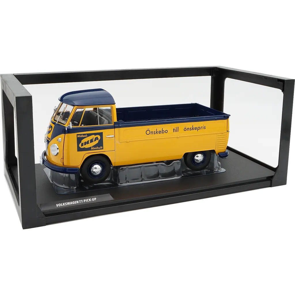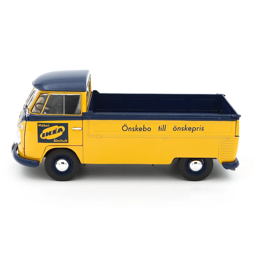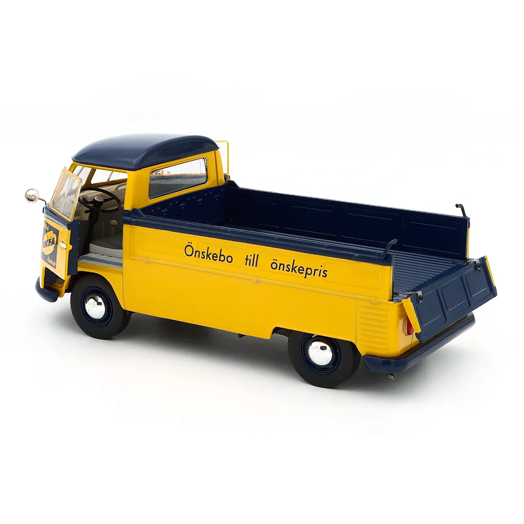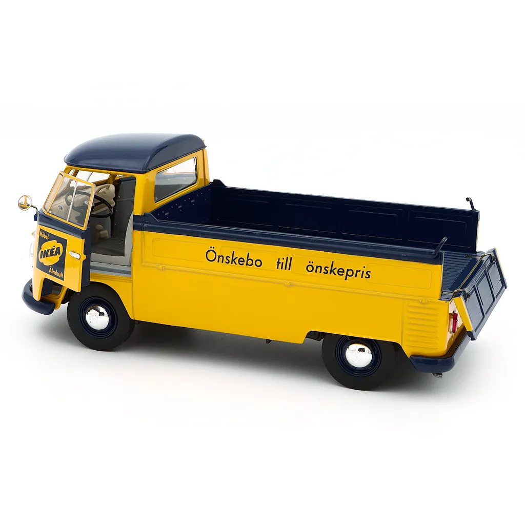 Volkswagen T1 från 1950 i pickup-utförande med IKEA-möbelvaruhusets färger, logotyp och texter. T1:an är en modell för vuxna samlare tillverkad i metall av Solido i skala 1:18 (23 cm).