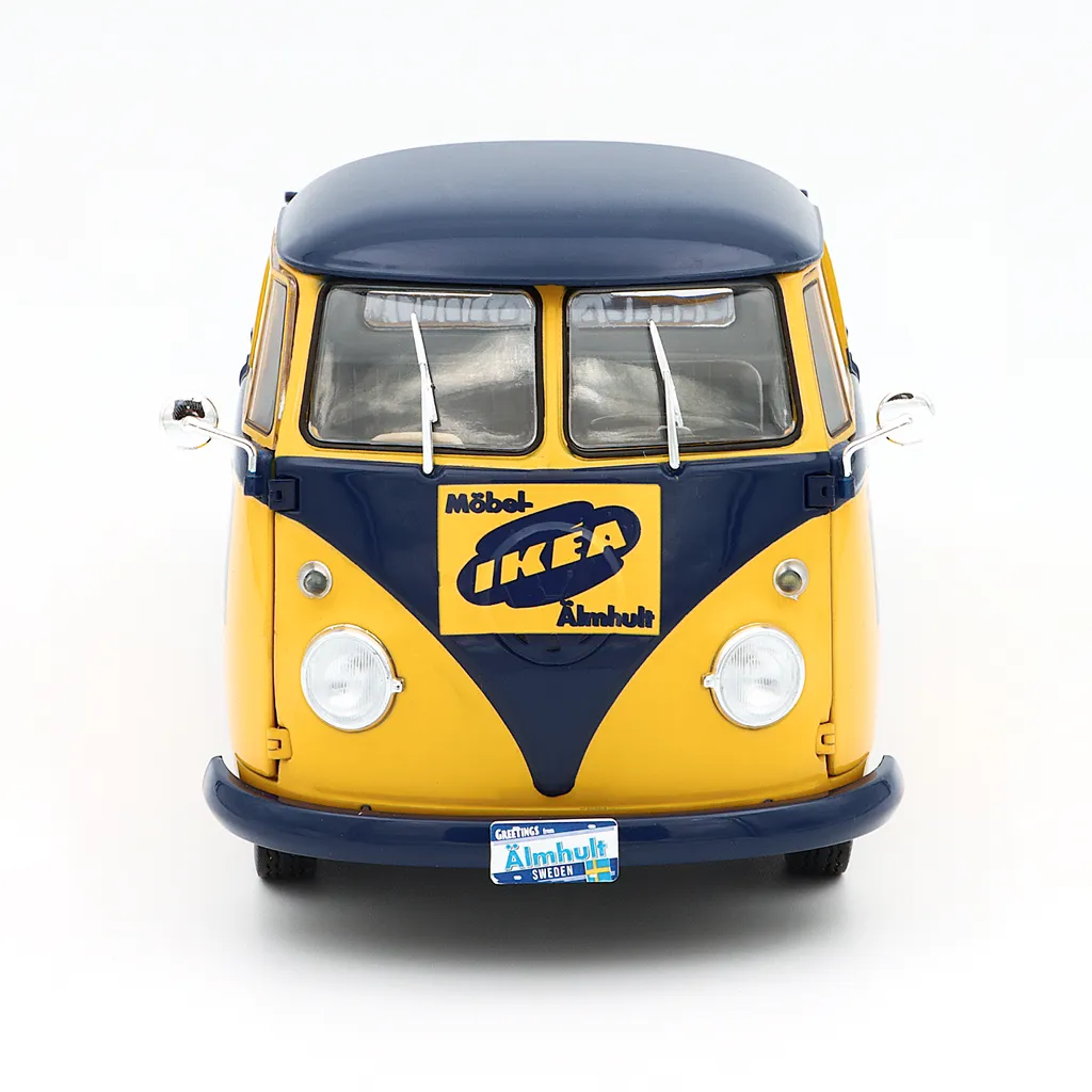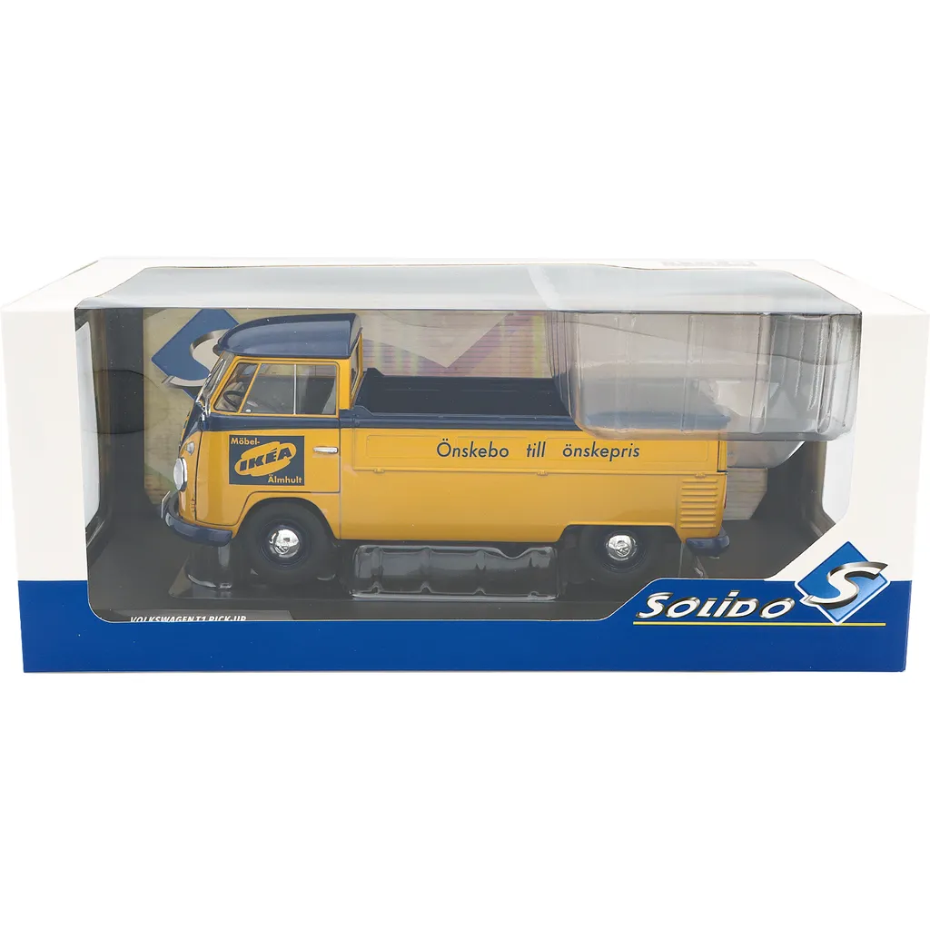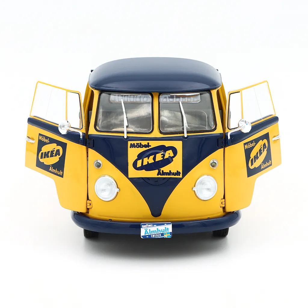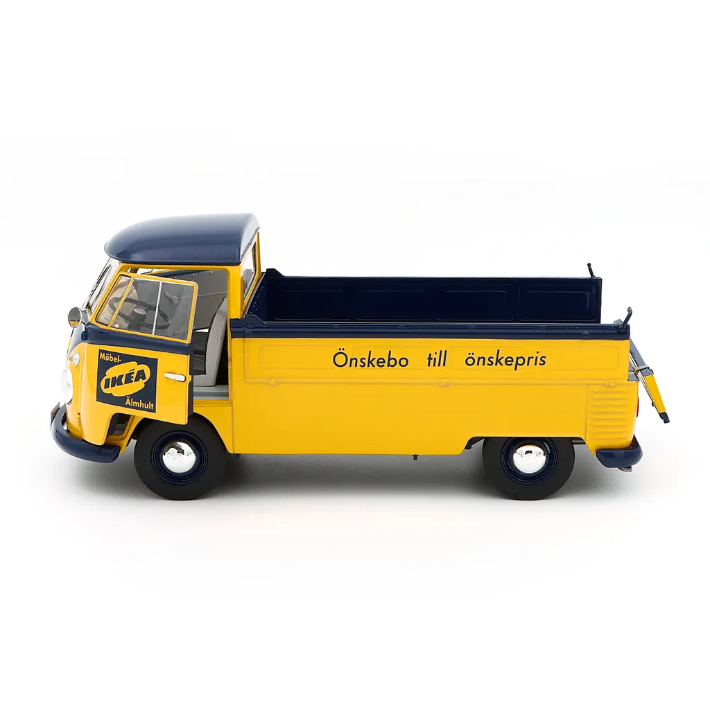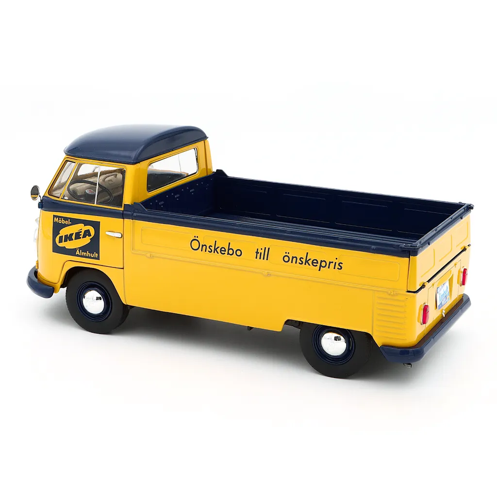 Volkswagen T1 från 1950 i pickup-utförande med IKEA-möbelvaruhusets färger, logotyp och texter. T1:an är en modell för vuxna samlare tillverkad i metall av Solido i skala 1:18 (23 cm).