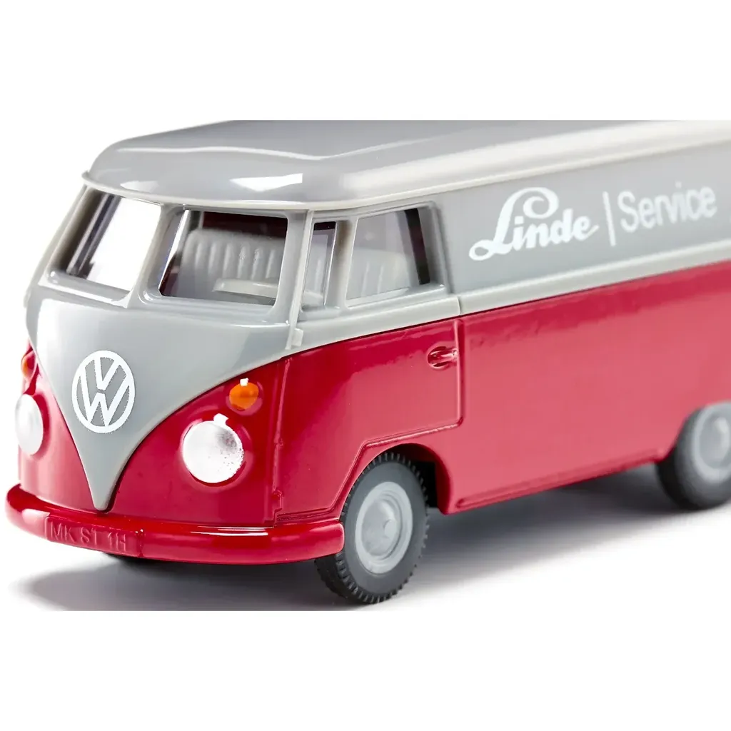 Volkswagen T1 Transporter i skala 1:50 (9,2 cm) från Siku. Den grå och röda transportbilen är dekorerad med texten "Linde | Service" och en gaffeltruck.