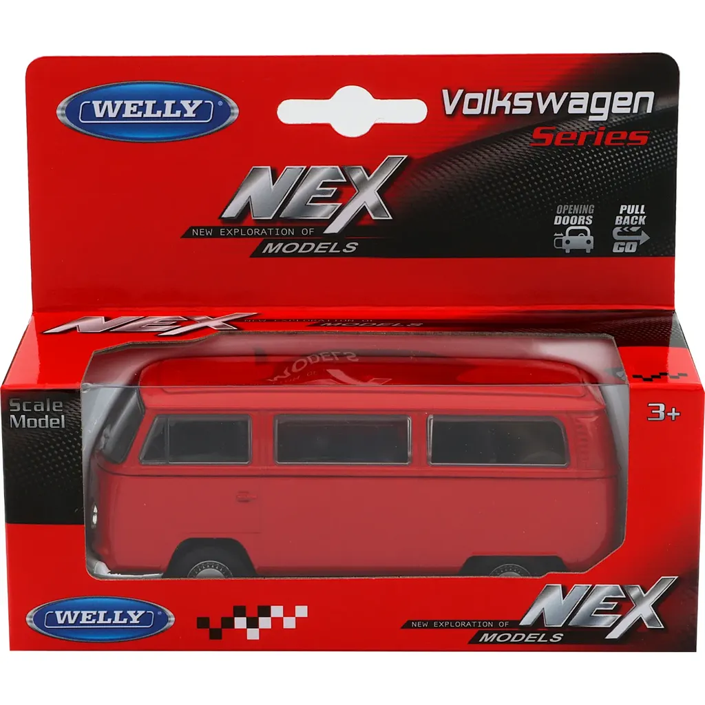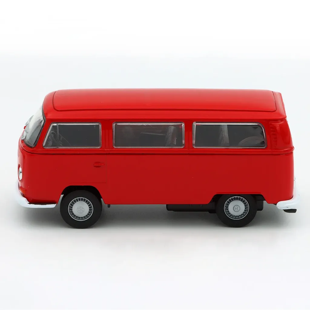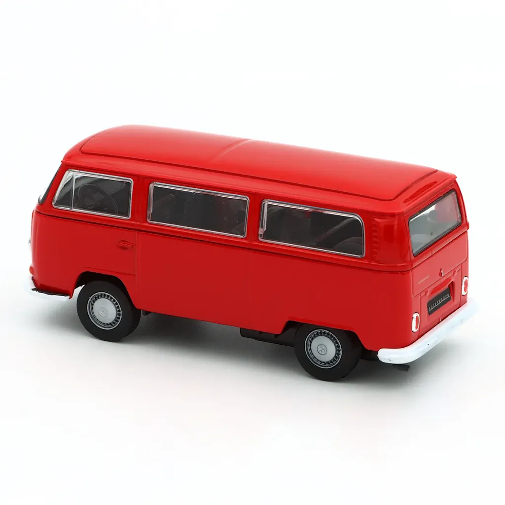 Folkabussen T2 från 1972 som röd leksaksbil från Welly. Bilen är 11 cm lång (skala 1:34).