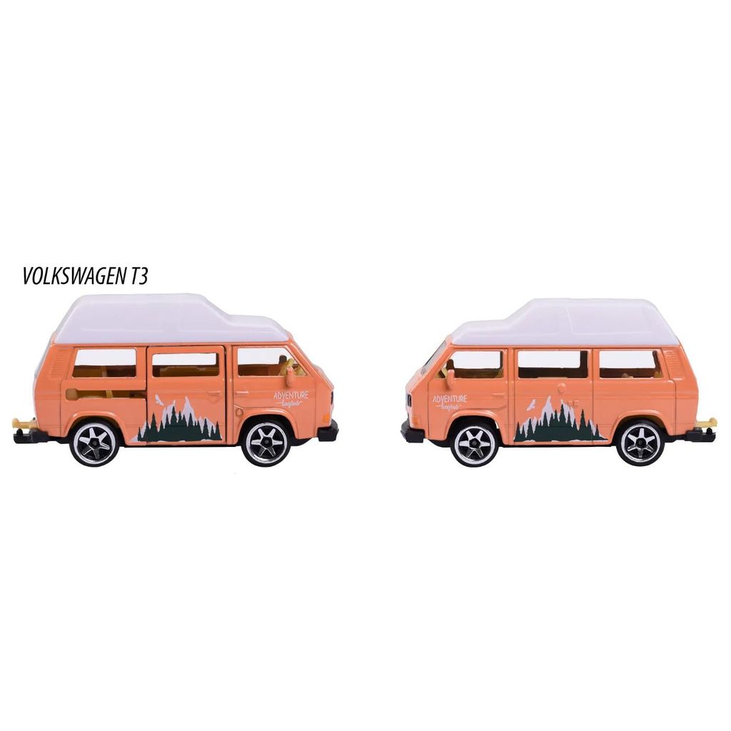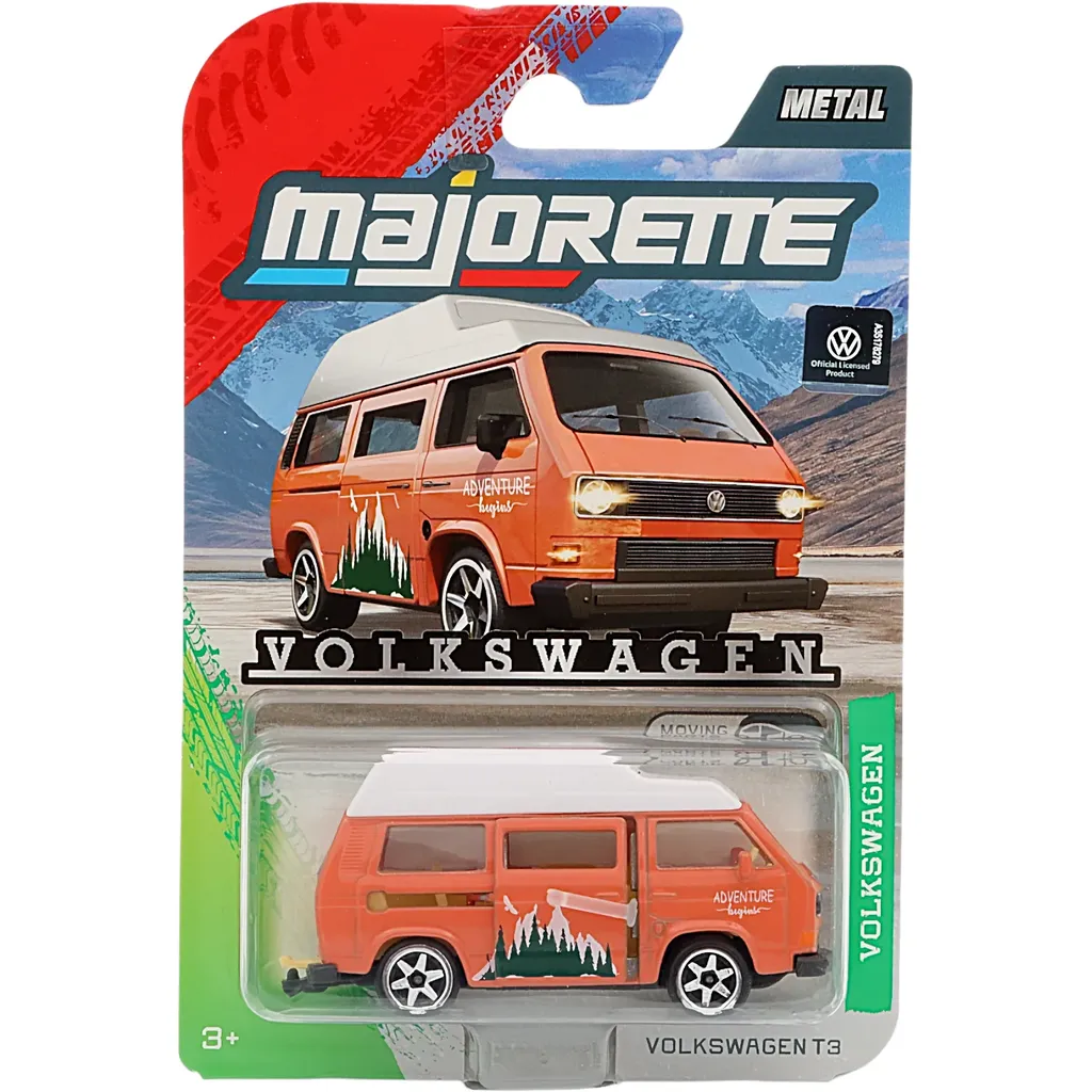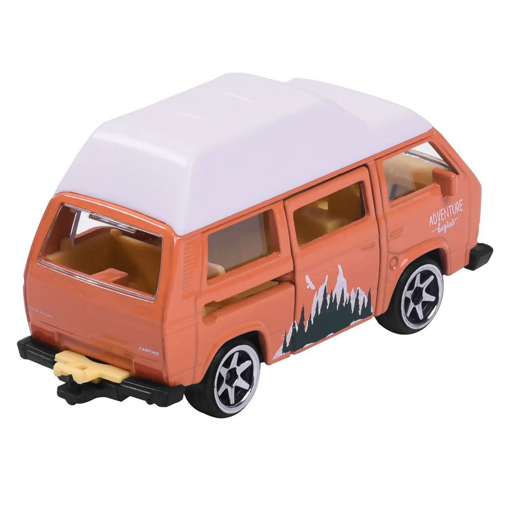 Från Majorettes serie Volkswagen kommer denna fina Volkswagen T3. Bussen är orange med friluftsmotiv i form av berg och gröna granar. Bussen har vitt tak och öppningsbar skjutdörr på höger sida.