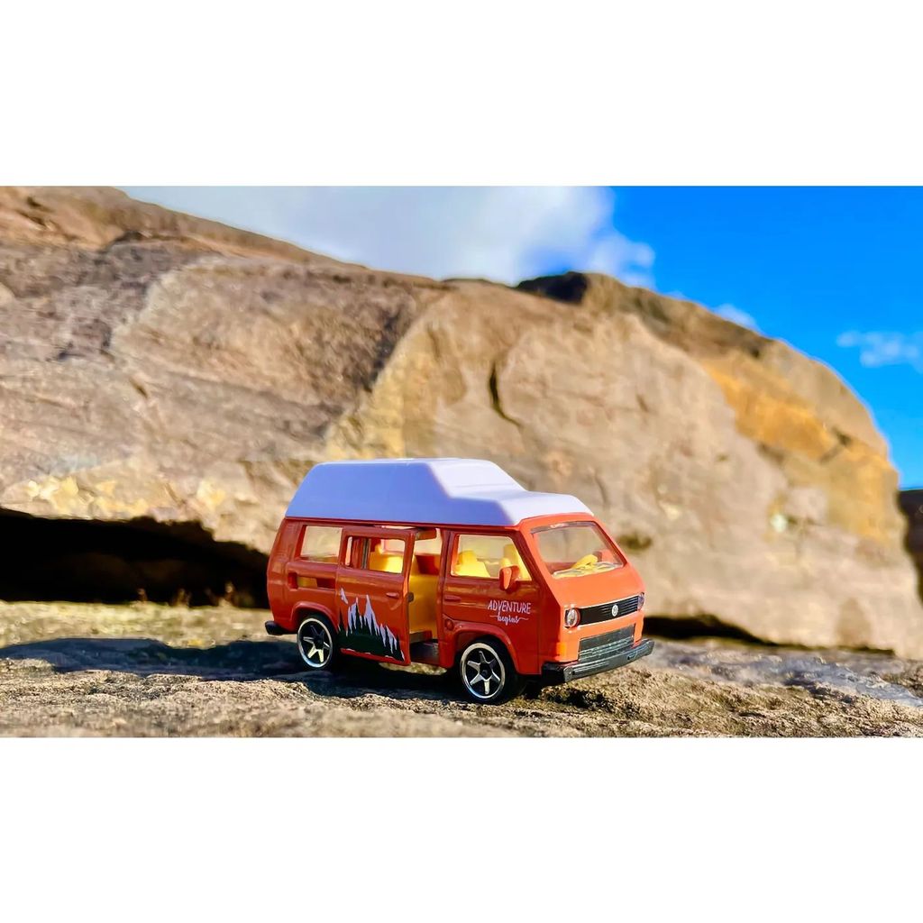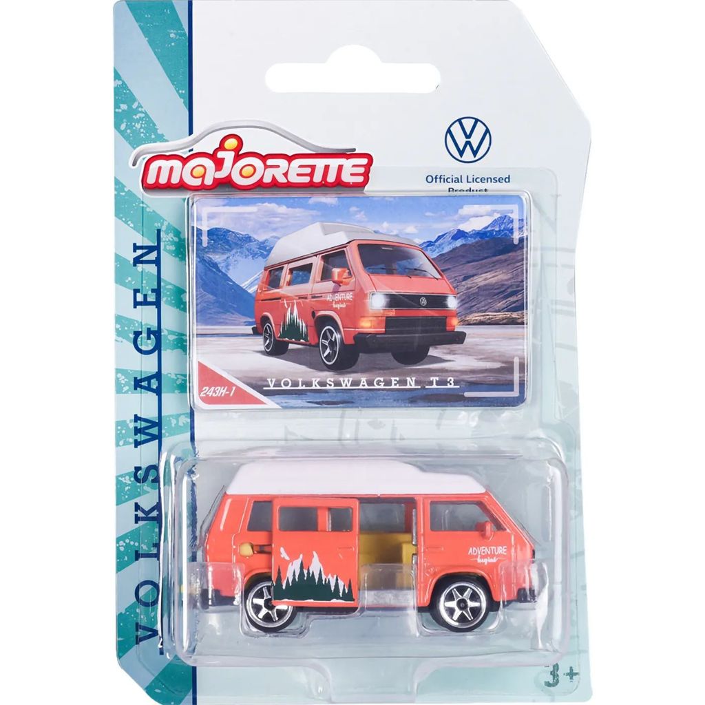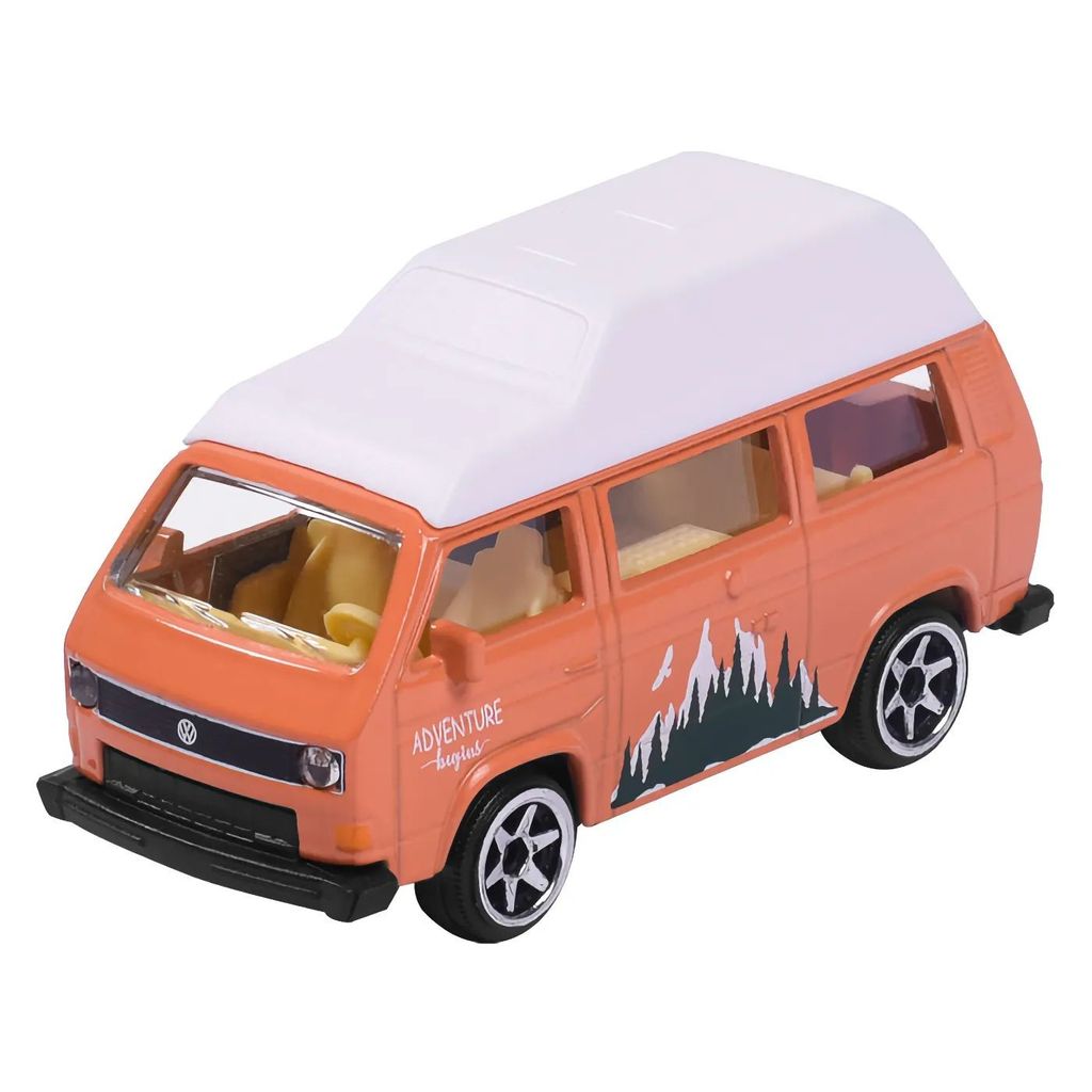 Från Majorettes serie Volkswagen kommer denna fina Volkswagen T3. Bussen är orange med friluftsmotiv i form av berg och gröna granar. Bussen har vitt tak och öppningsbar skjutdörr på höger sida.