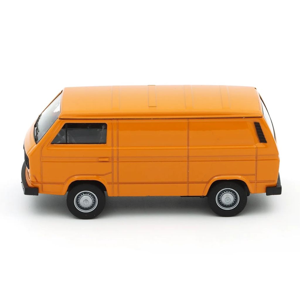 Orange Volkswagen T3 VAN från Welly. Transportbilen är 11 cm (skala ca 1:34-1:39).