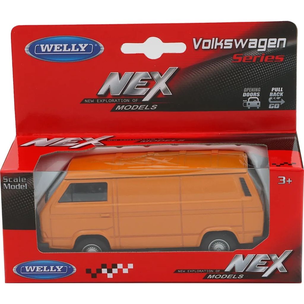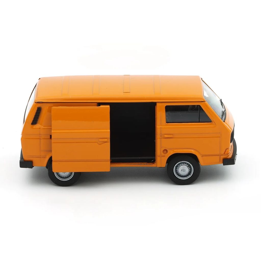Orange Volkswagen T3 VAN från Welly. Öppningsbar skjutdörr och pullback. Transportbilen är 11 cm (skala ca 1:34-1:39).