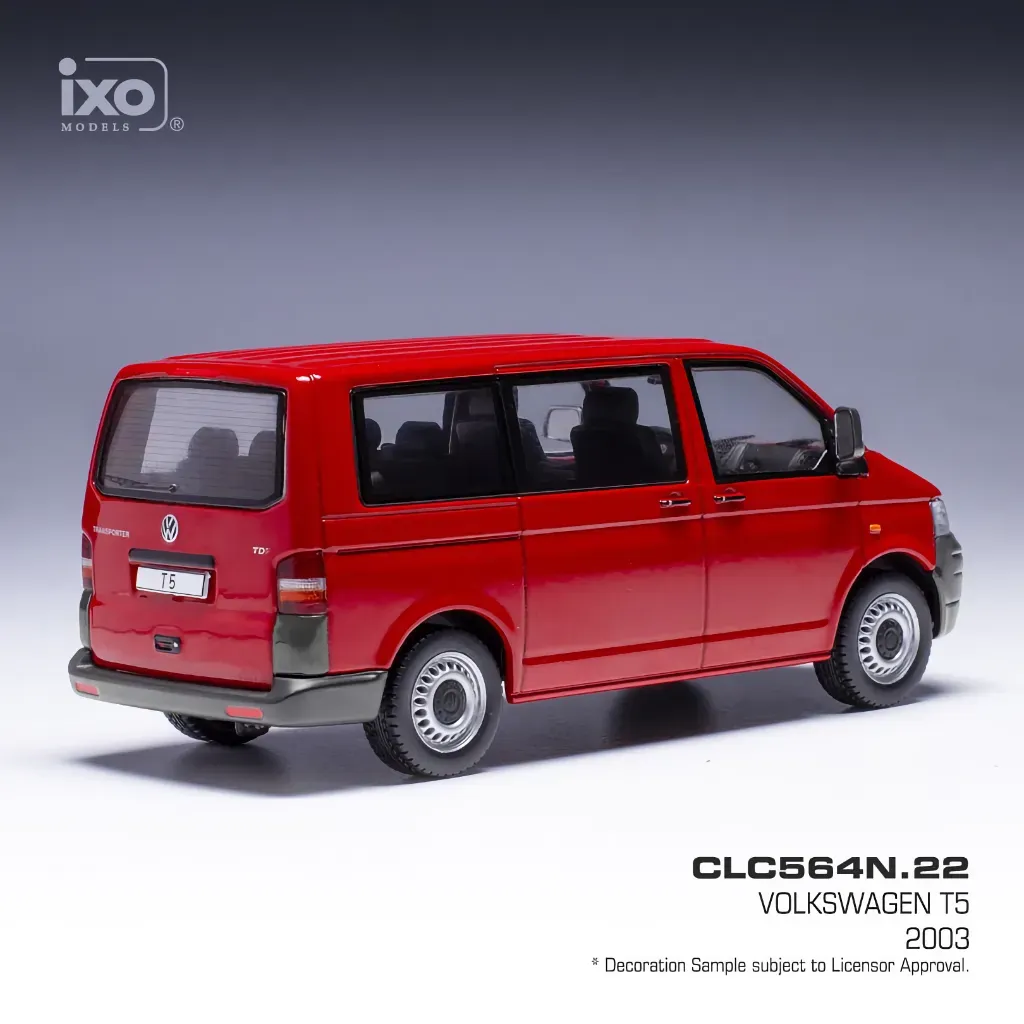 Volkswagen T5 TDI, årsmodell 2003, i rött som modellbil från Ixo Models i skala 1:43 (11,5 cm).
