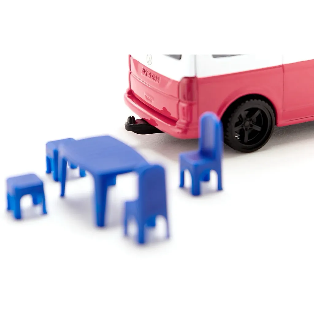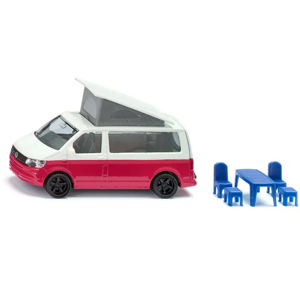 Röd och vit Volkswagen T6 (Transporter) California från Siku i skala 1:50 (10 cm). T6:an är utrustad för semester och kommer med bord och stolar.
