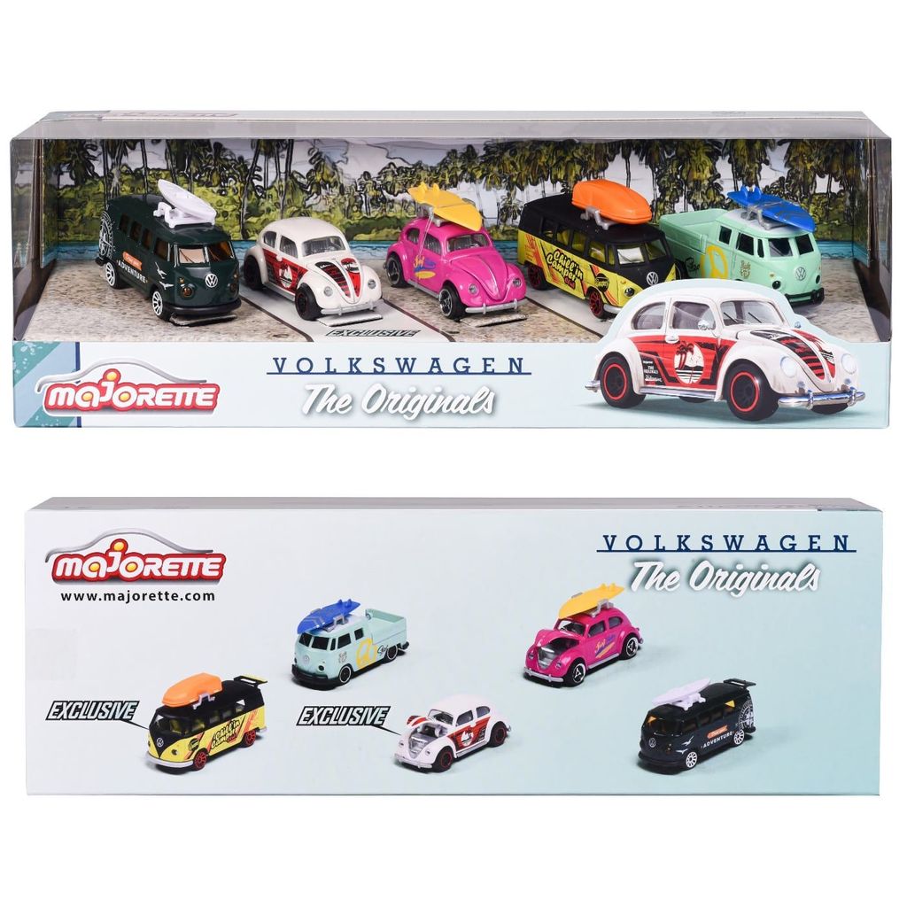 Fem leksaksbilar i metall från Majorette och deras giftpack "Volkswagen - The Originals".
