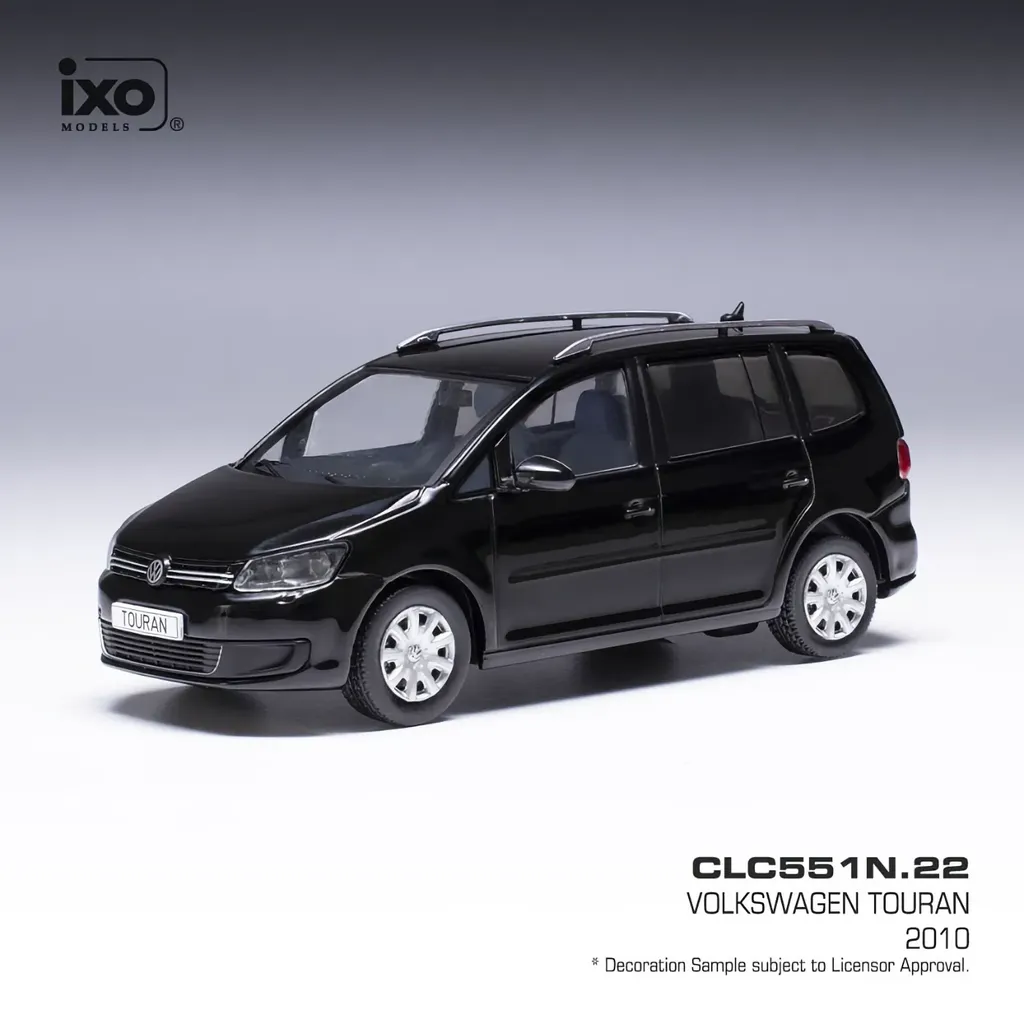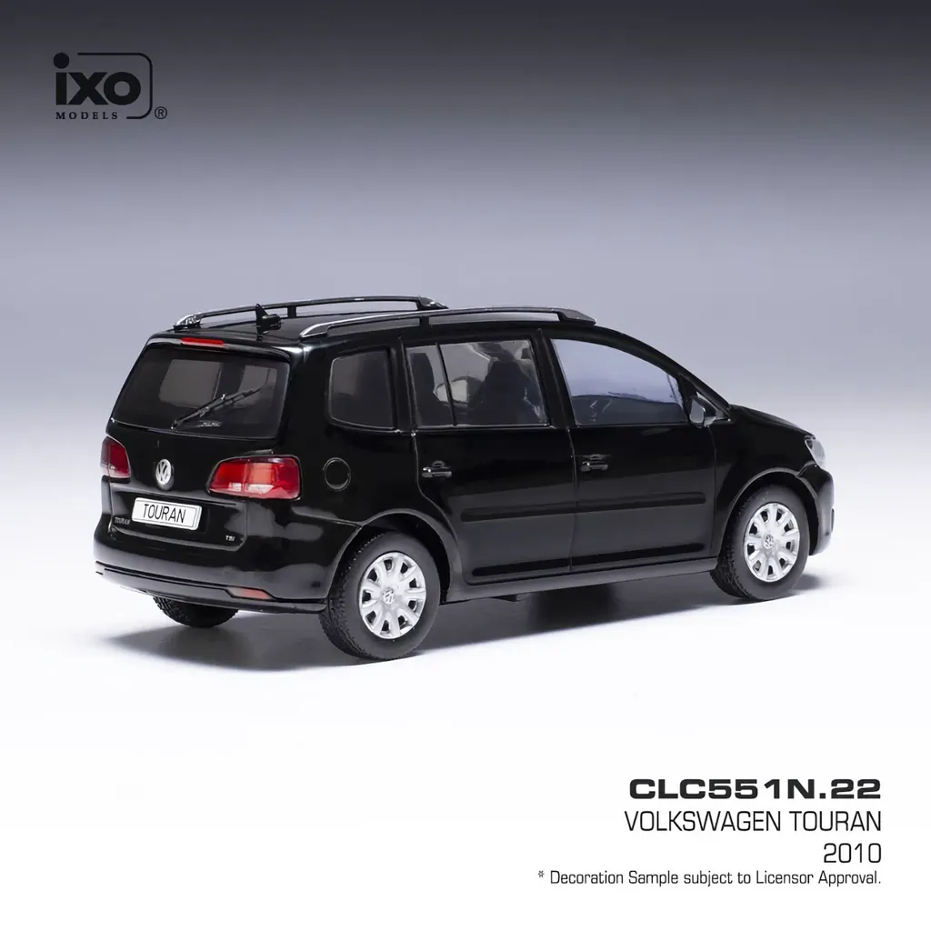 Modellen kommer monterad på en svart bottenplatta med modellens nummer och namn angivet, "CLC551N.22 - Volkswagen Touran - 2010".