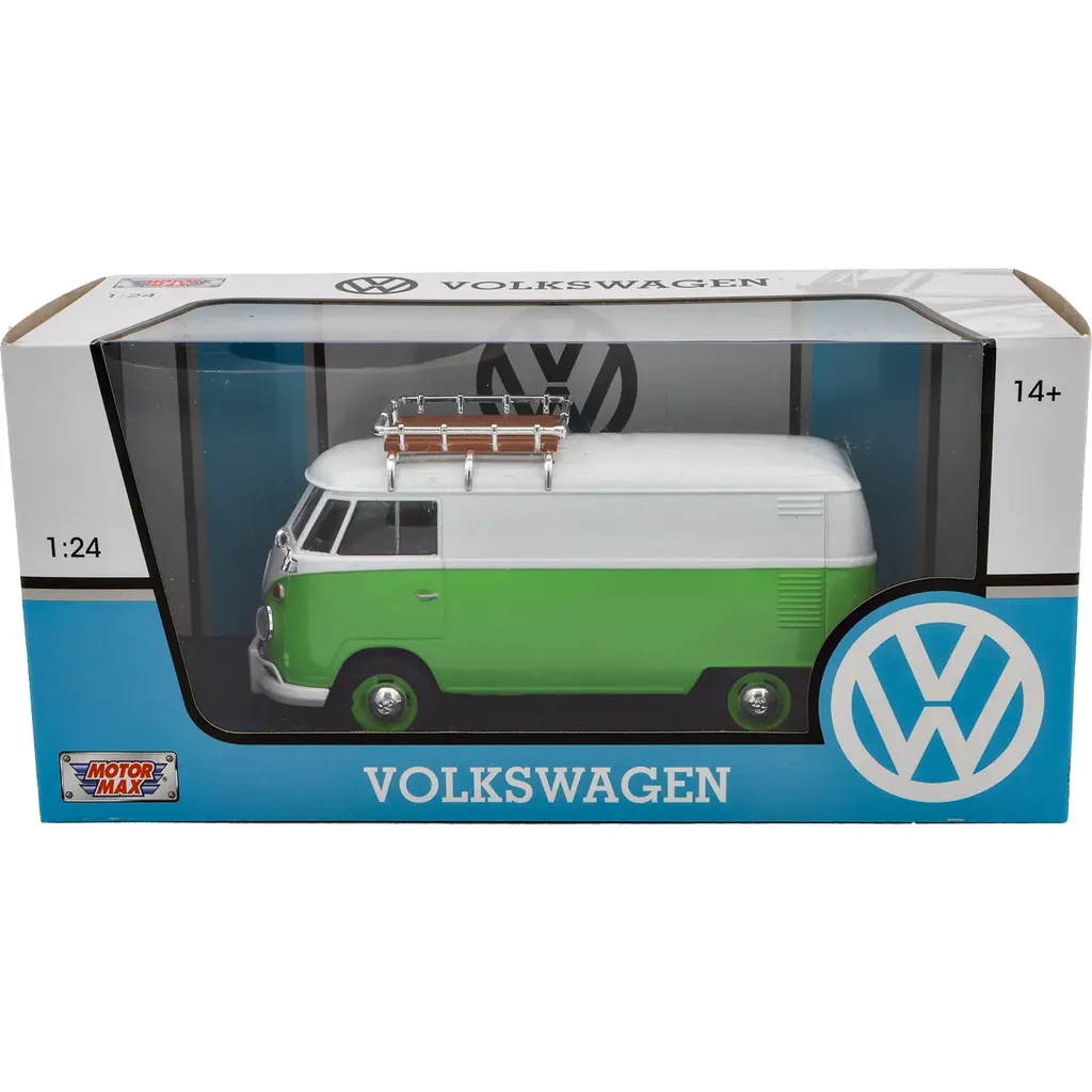 Volkswagen Type 2 (T1) som modellbil från Motormax i skala 1:24 (18 cm). Bussen är grön och vit och har takförvaring.
