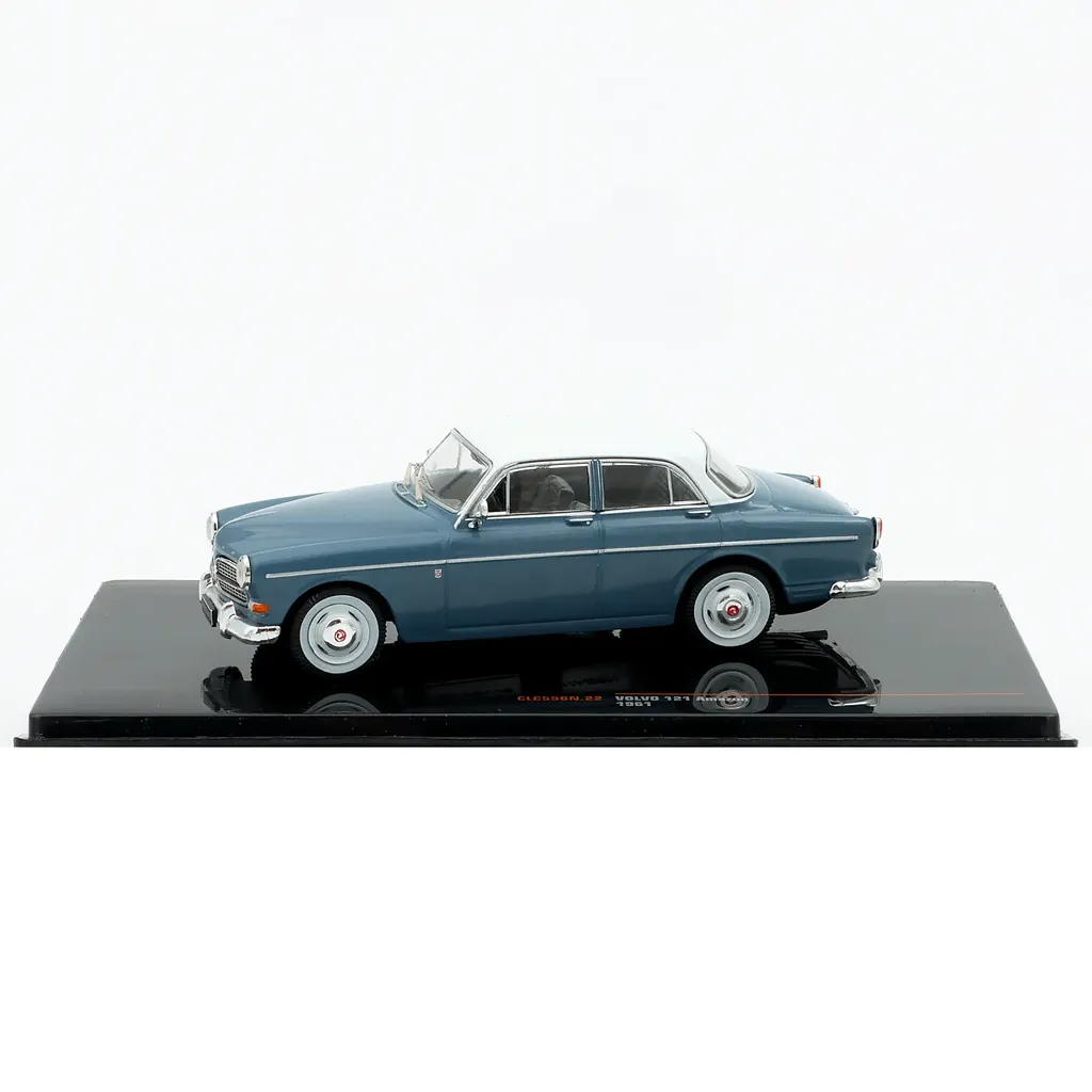 Volvo 121 Amazon (årsmodell 1961) i grått (åt det blå hållet) med vitt tak som modellbil från Ixo Models. Modellen är i skala 1:43 (10 cm).