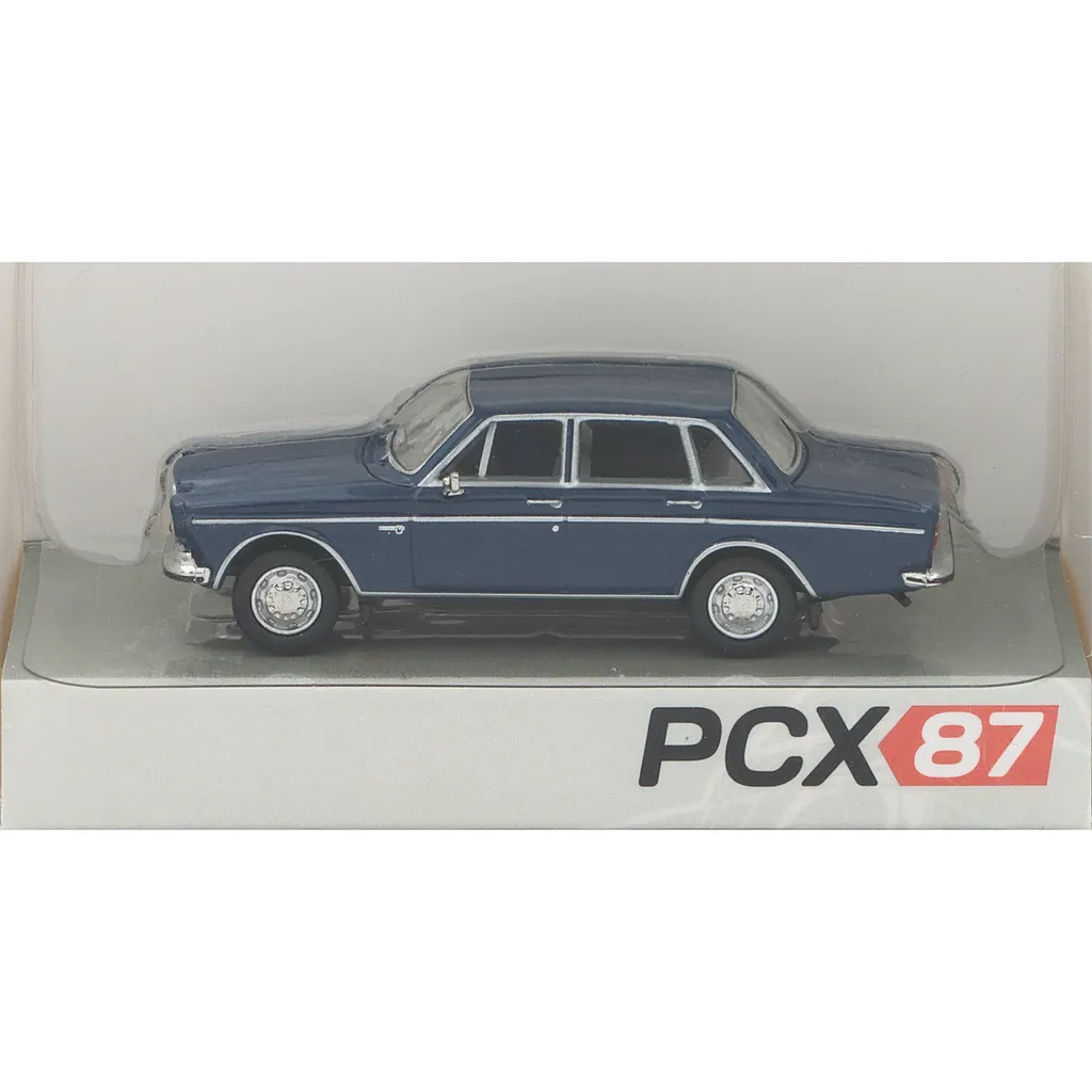 Volvo 164 i färgen mörkblå från tillverkaren PCX87. Modellen är i skala 1:87 (5 cm) och avsedd för samling eller prydnad.