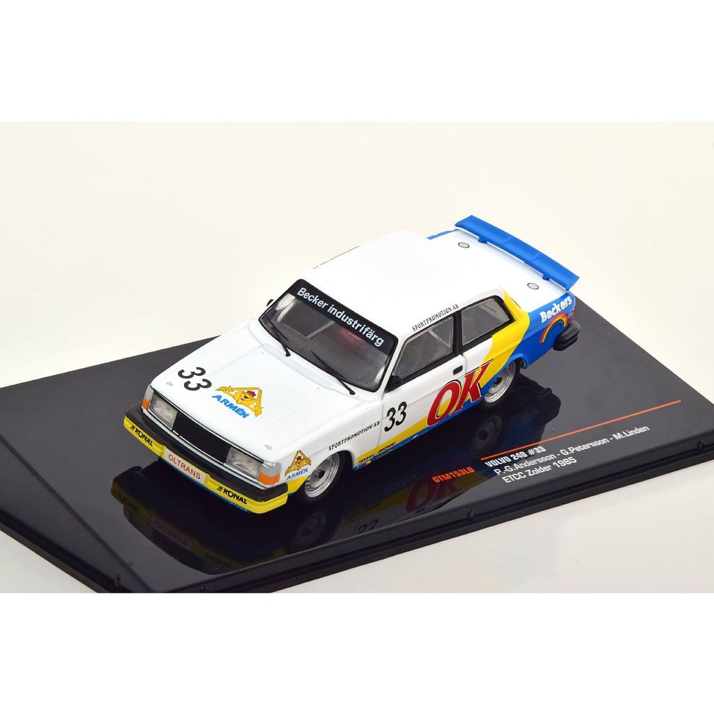 Volvo 240 från 1985 som modellbil från Ixo Models i skala 1:43 (ca 11 cm). Den här Volvon är i racingutförande då den gick i tävlingen European Touring Car Championship 1985 och kördes av Per-Gunnar "Peggen" Andersson, Greger Petersson och Mats Lindén på racingbanan i Zolder i Belgien.