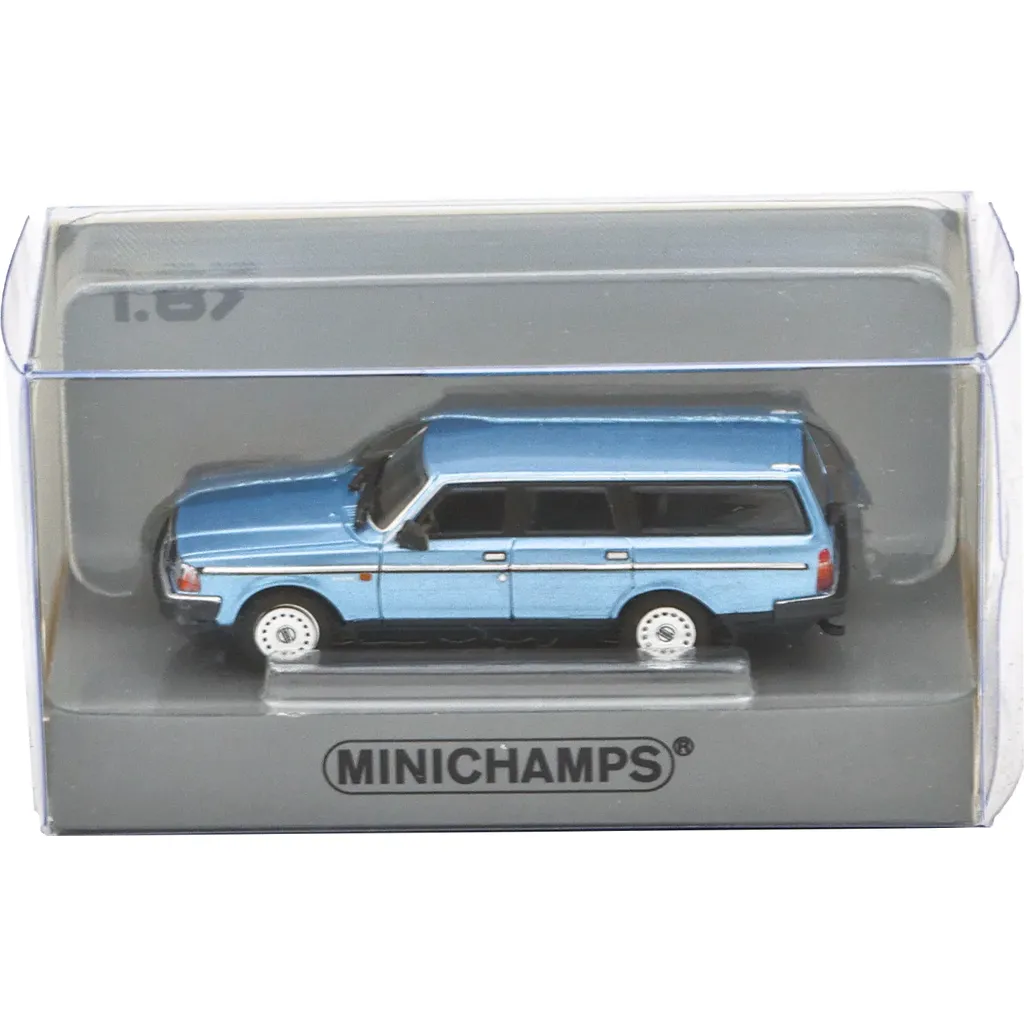 Volvo 240 GL (245) herrgårdsvagn i blåmetallic som modellbil från Minichamps. Observera att det här är en liten bil i skala 1:87 (5,5 cm) som ofta används tillsammans med modelljärnvägar i skala H0.
