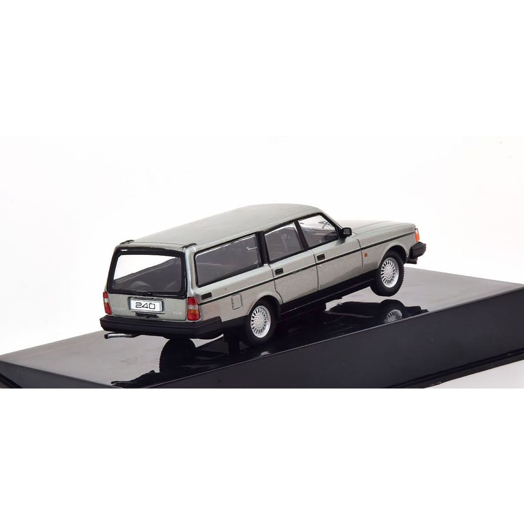 Fin Volvo 240-modell från Ixo Models i skala 1:43 (ca 11 cm lång). Bilen är gråmetallic och årsmodellen är 1988.