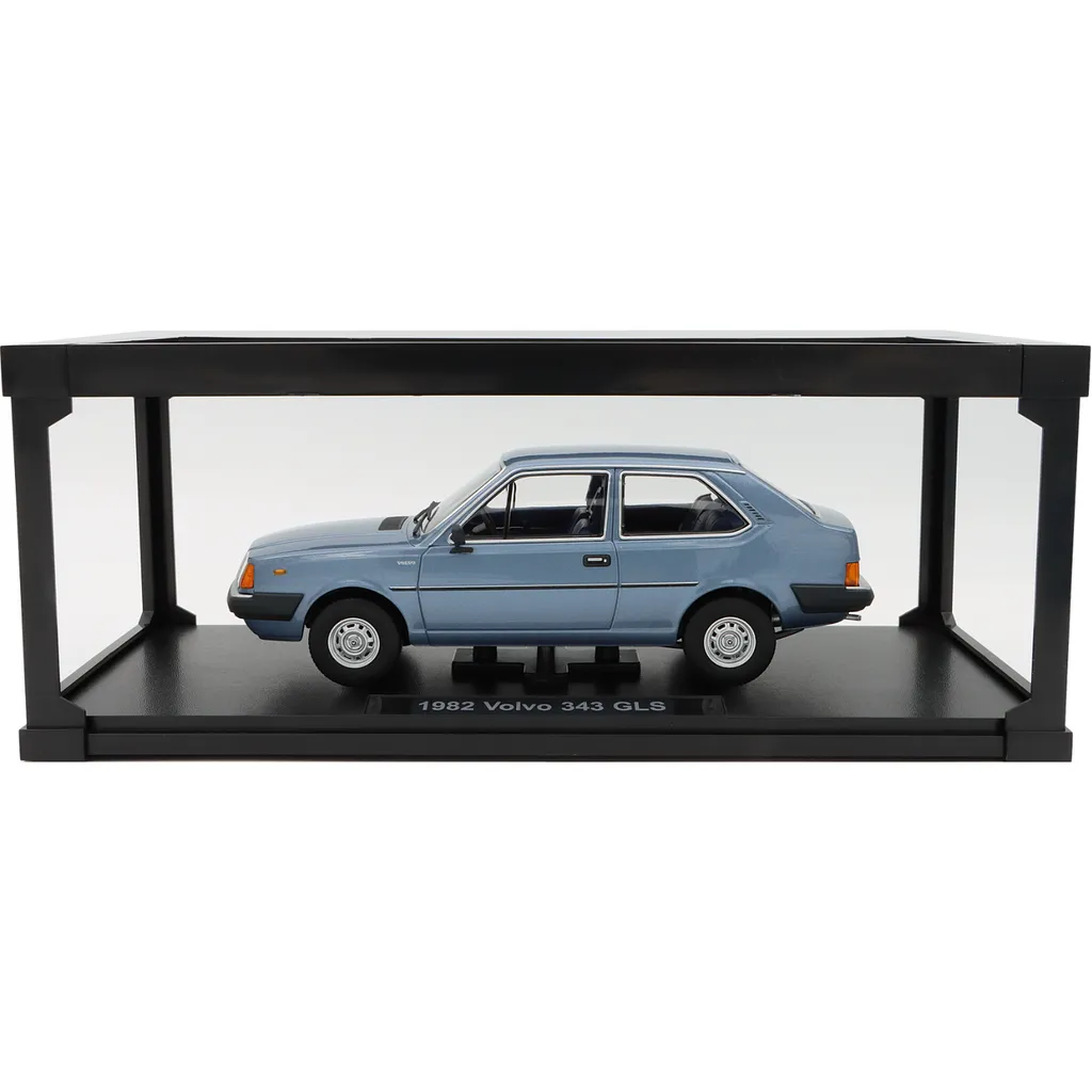 Bilen levereras stående på en svart presentationsplatta med modellnamnet "1982 Volvo 343 GLS" angivet i silver.