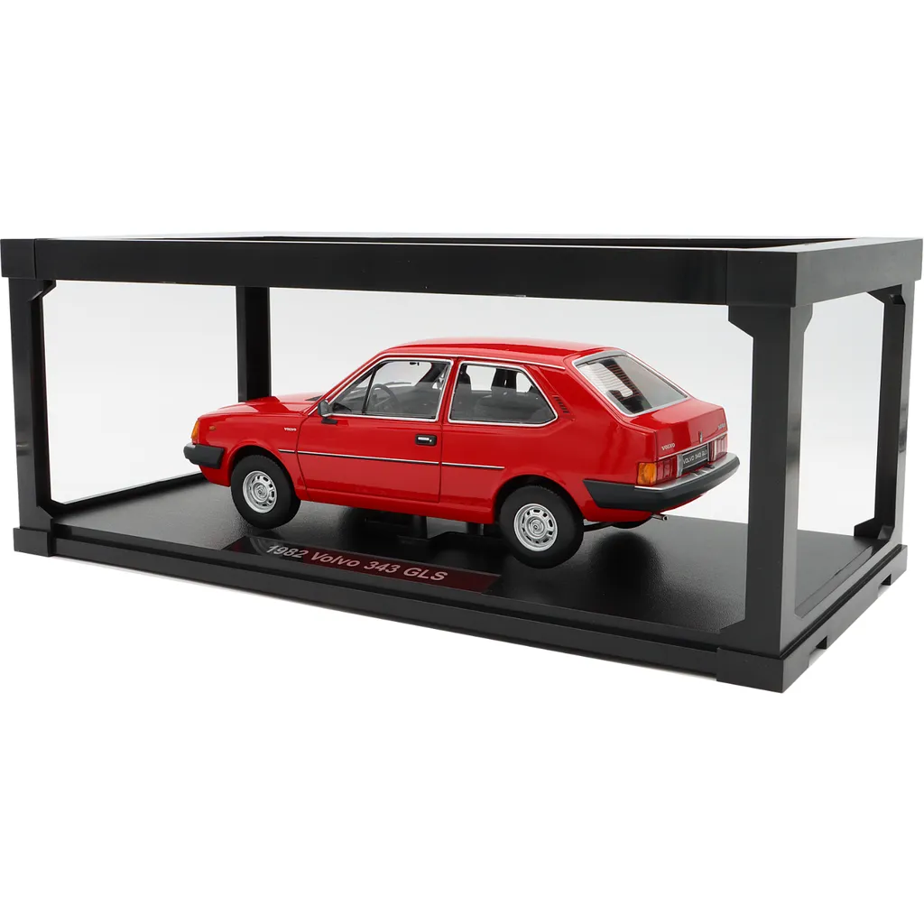 Bilen levereras stående på en svart presentationsplatta med modellnamnet "1982 Volvo 343 GLS" angivet i silver.
