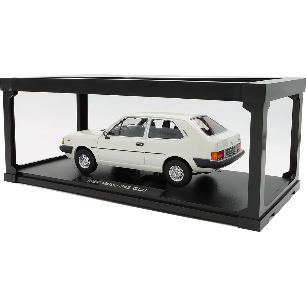 Bilen levereras stående på en svart presentationsplatta med modellnamnet "1982 Volvo 343 GLS" angivet i silver.