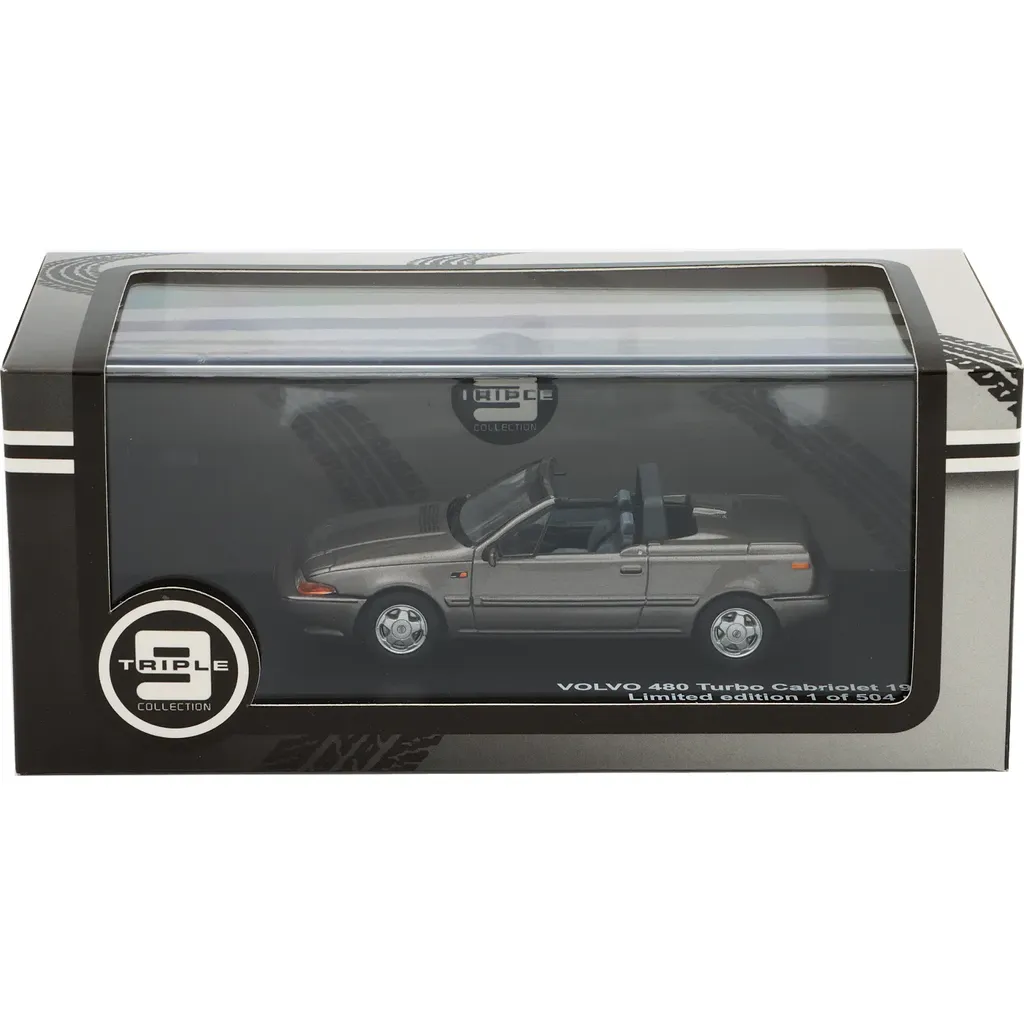 Volvo 480 Turbo Cabriolet 1990 i silver som modellbil tillverkad av Triple9 i skala 1:43 (9,8 cm).