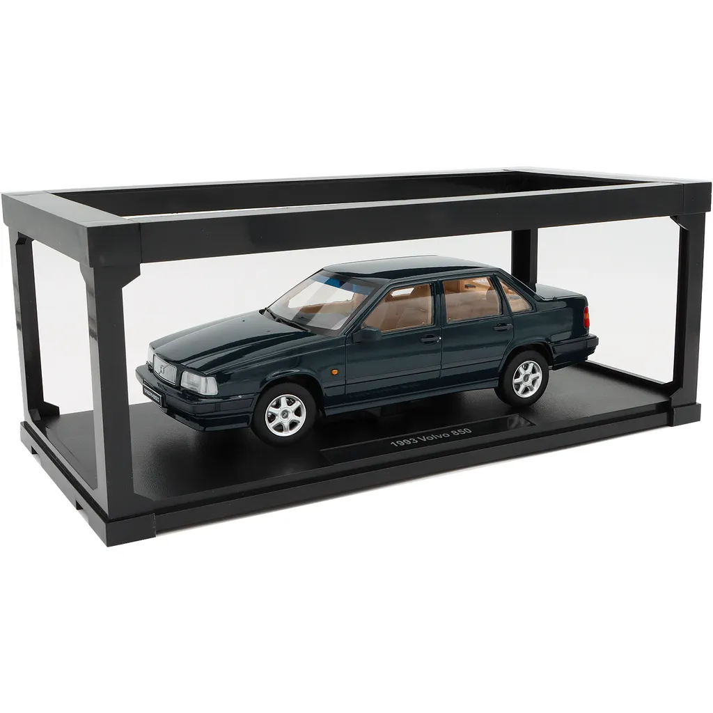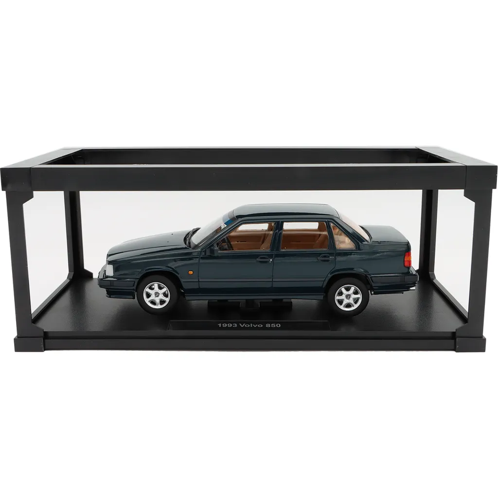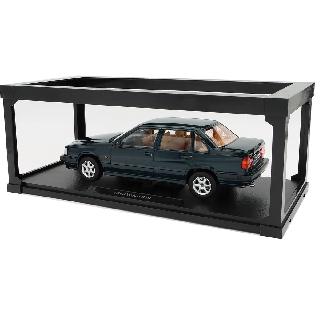 Volvon levereras i en kartonglåda med fönster där bilen är monterad på en svart bottenplatta med texten "1993 Volvo 850".