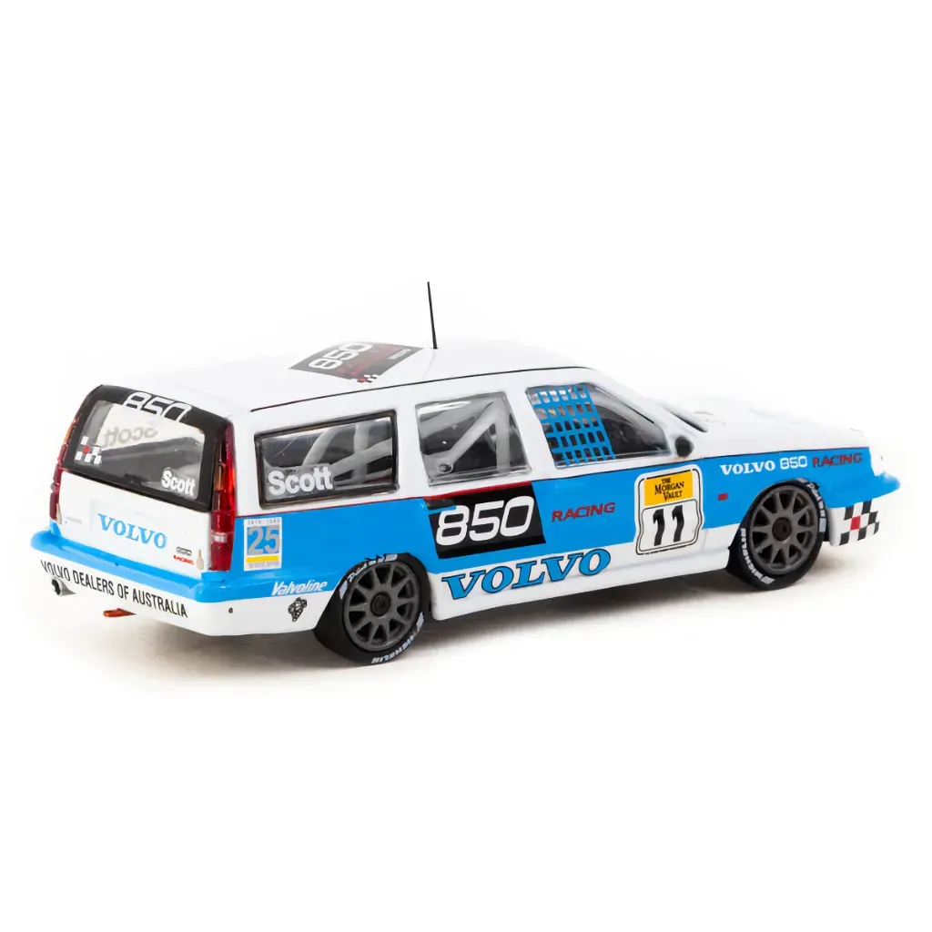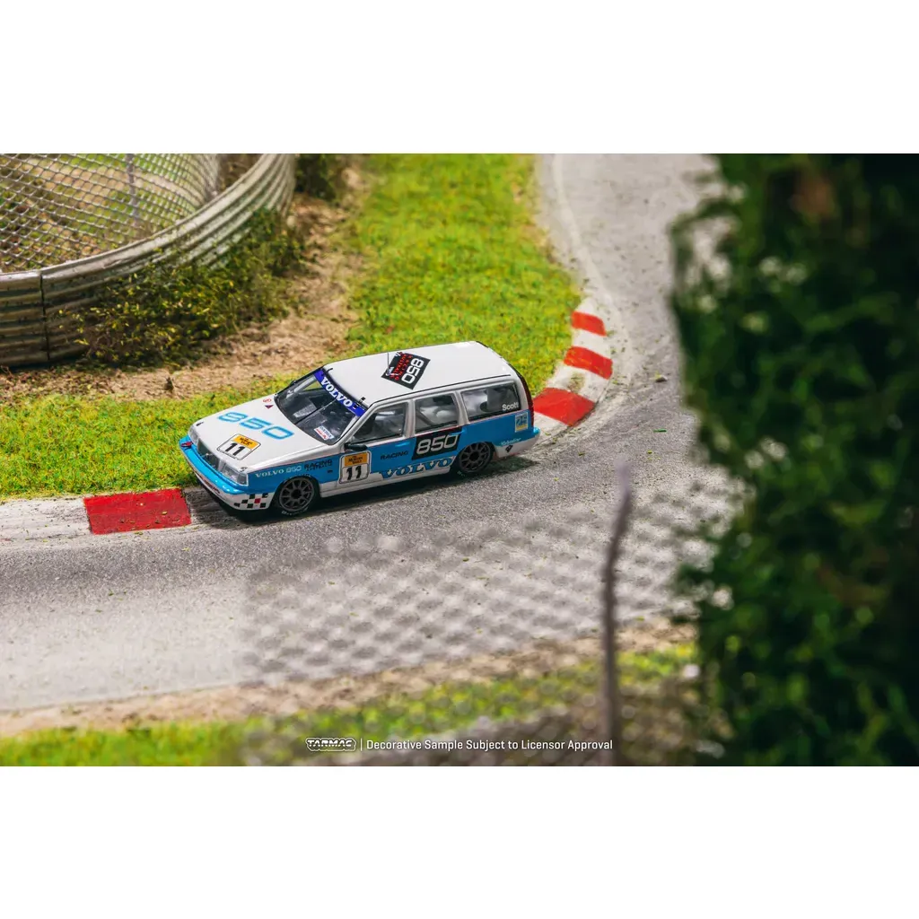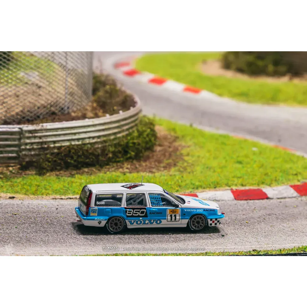 Volvo 850 Estate Australian Super Touring Championship 1995 från Tarmac Works och serien HOBBY64. Volvon är vit och blå och skalan är 1:64 (7,5 cm).