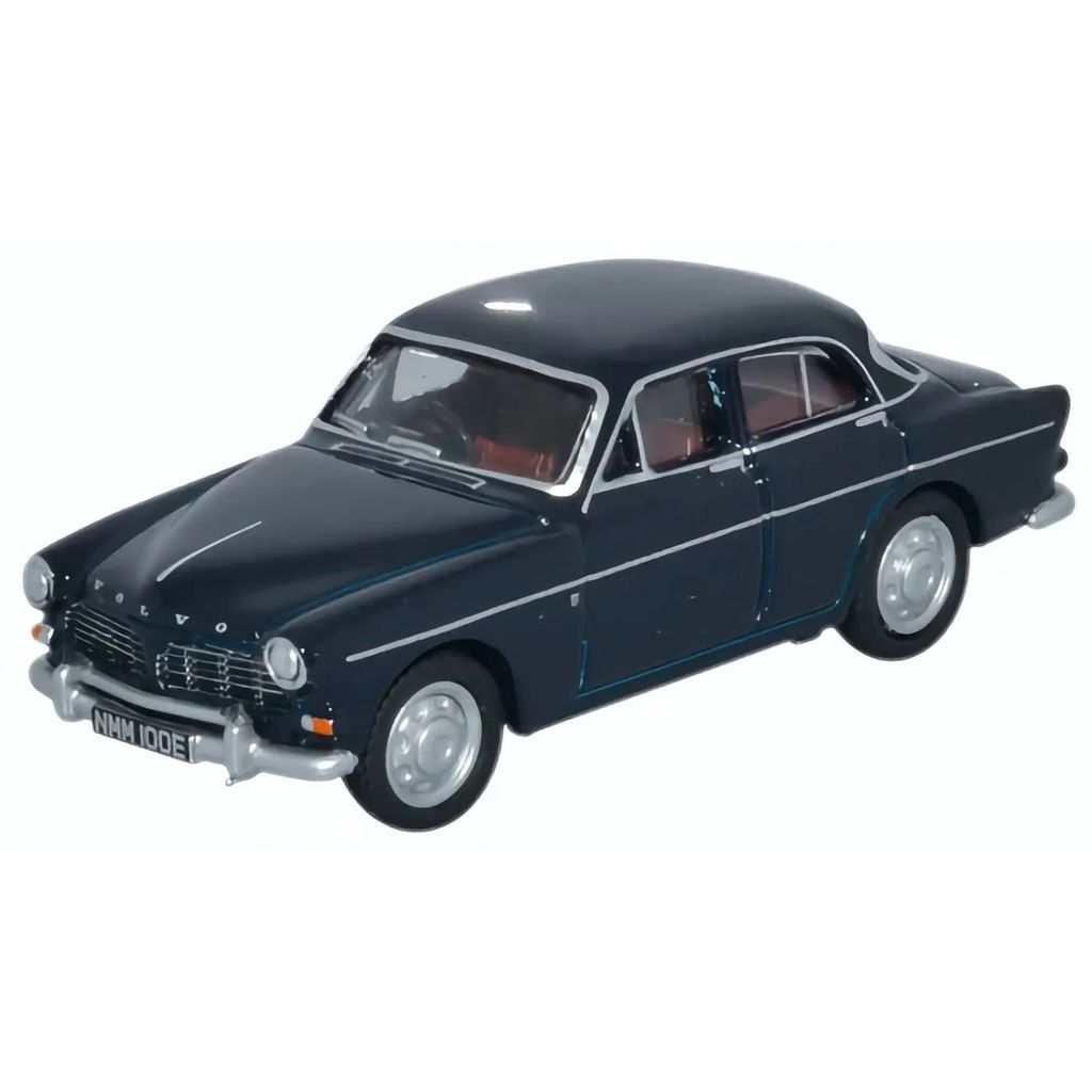 Mörkblå Volvo Amazon från Oxford i skala 1:76 (5,9 cm). Bilen levereras i en vitrinbox.