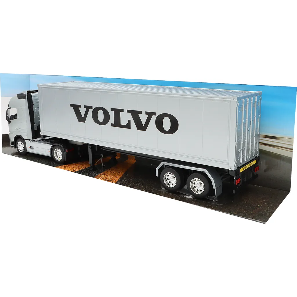 Volvo FH 500 med trailer som modell från Welly i skala 1:32 (längd ekipage 49 cm). Dragbilen är i silver och trailern grå med Volvos logotyp.